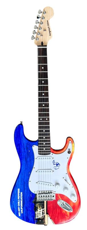 Custom Autograph Edition Stratocaster style electric guitar measures approximately 39" in length and has been hand-signed on the pickguard by Flea (bassist).