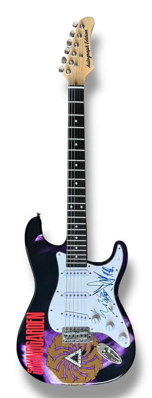 Custom Autograph Edition Stratocaster style electric guitar measures approximately 39" in length and has been hand-signed on the pickguard by Chris Cornell (lead singer), Kim Thayil (lead guitarist), Ben Sheppard (lead bassist), and Matt Cameron (drummer).