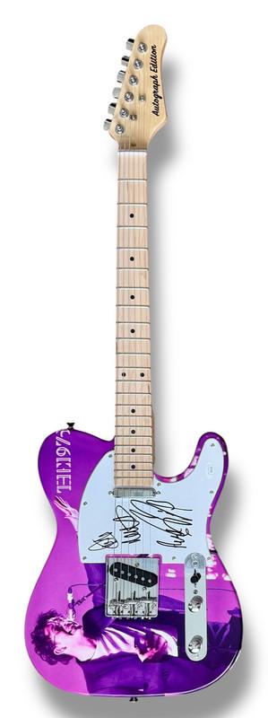 Custom Autograph Edition Telecaster style electric guitar measures approximately 39" in length and has been hand-signed on the pickguard by Matty Healy (lead singer), Adam Hann (lead guitarist), Ross MacDonald (lead bassist), and George Daniel (drummer).
