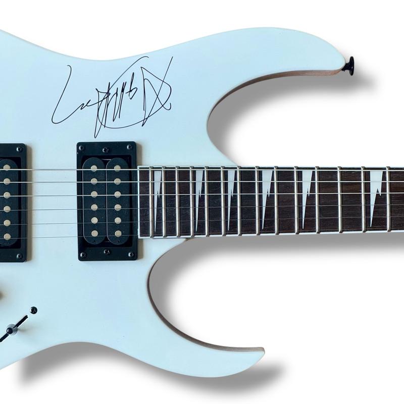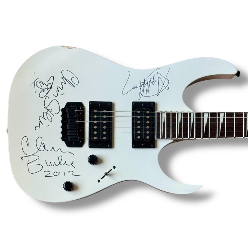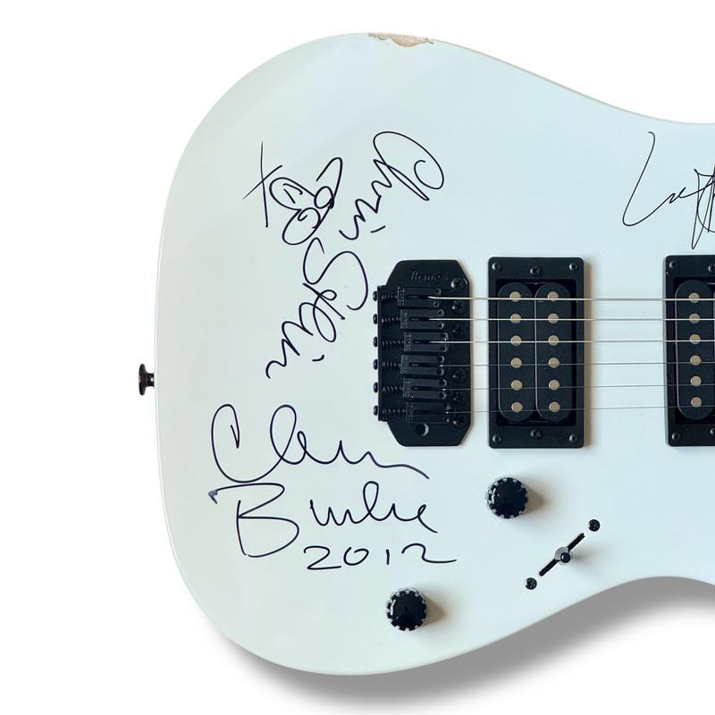 Electric guitar measures approximately 39" in length and has been hand-signed on body by Debbie Harry (lead singer), Chris Stein (lead guitarist), and Clem Burke (drummer). Please note there is some wear on the bottom of the guitar.