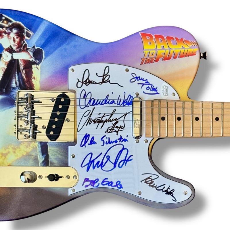 Custom Autograph Edition Telecaster style electric guitar measures approximately 39" in length and has been hand-signed on the pickguard by Michael J. Fox (Marty McFly), Christopher Lloyd (Dr. Emmett Brown), Lea Thompson (Lorraine Baines), Tom Wilson (Biff Tannen), Claudia Wells (Jennifer Parker), Alan Silvestri (Score composer), Bob Gale (Writer), and James Tolkan (Mr. Strickland).