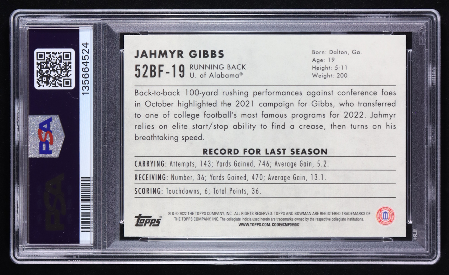 Jahmyr Gibbs 2022 Bowman Chrome University '52 Bowman #52BF19 RC (PSA 9)