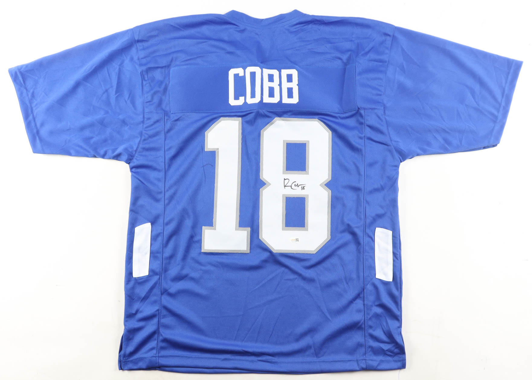 Custom jersey. Everything sewn on, size XL. Hand signed by Randall Cobb. Please note, glue is visible through the reverse number.