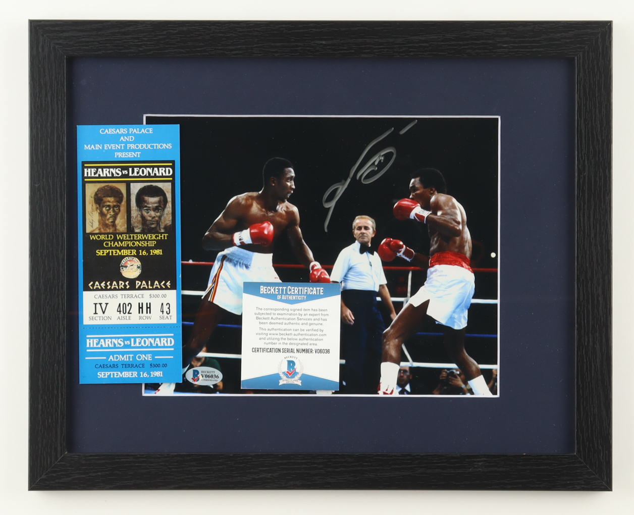 'Sugar' Ray Leonard Signed Custom Framed Photo Display with Original Fight Ticket (Beckett)