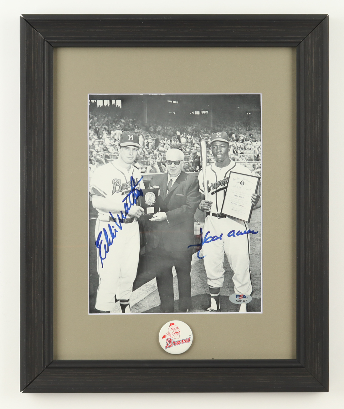 Frame measures approximately 13" x 16" in size. Featuring an 8" x 10" photo that has been hand-signed by Eddie Mathews (D. 2001, Milwaukee Braves, HOF) and Hank Aaron (D. 2021, Milwaukee Braves, HOF). Display also includes an Atlanta Braves logo lapel pin. Please see photos for details regarding the condition of the item.