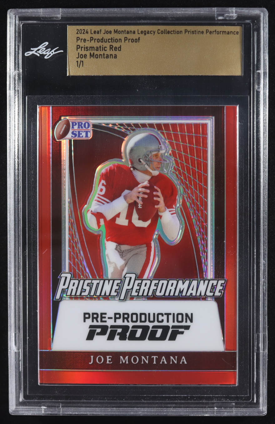 Joe Montana 2024 Leaf Joe Montana Legacy Pristine Performance Pre-Production Proof Prismatic Red #NNO #1/1 (Leaf)