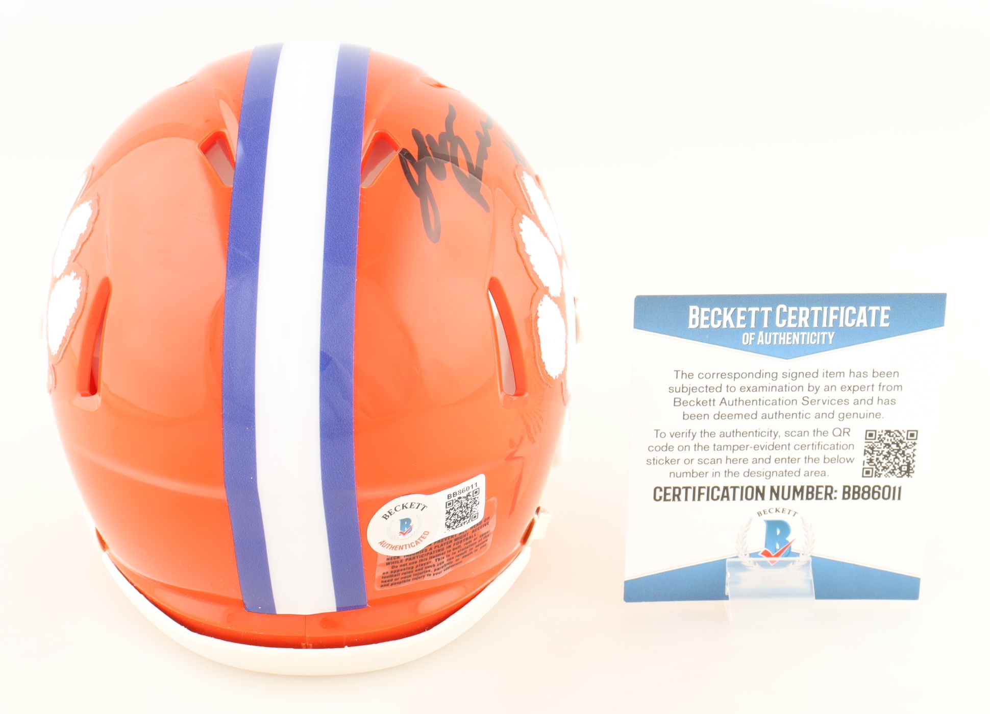 Riddell Clemson Tigers Speed mini helmet. Hand-signed and inscribed by Justyn Ross.