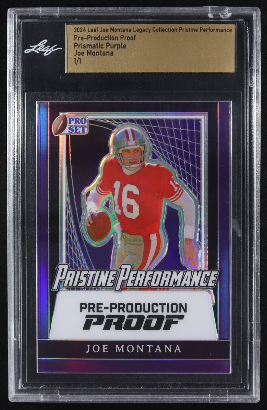 Joe Montana 2024 Leaf Joe Montana Legacy Pristine Performance Pre-Production Proof Prismatic Purple #NNO #1/1 (Leaf)