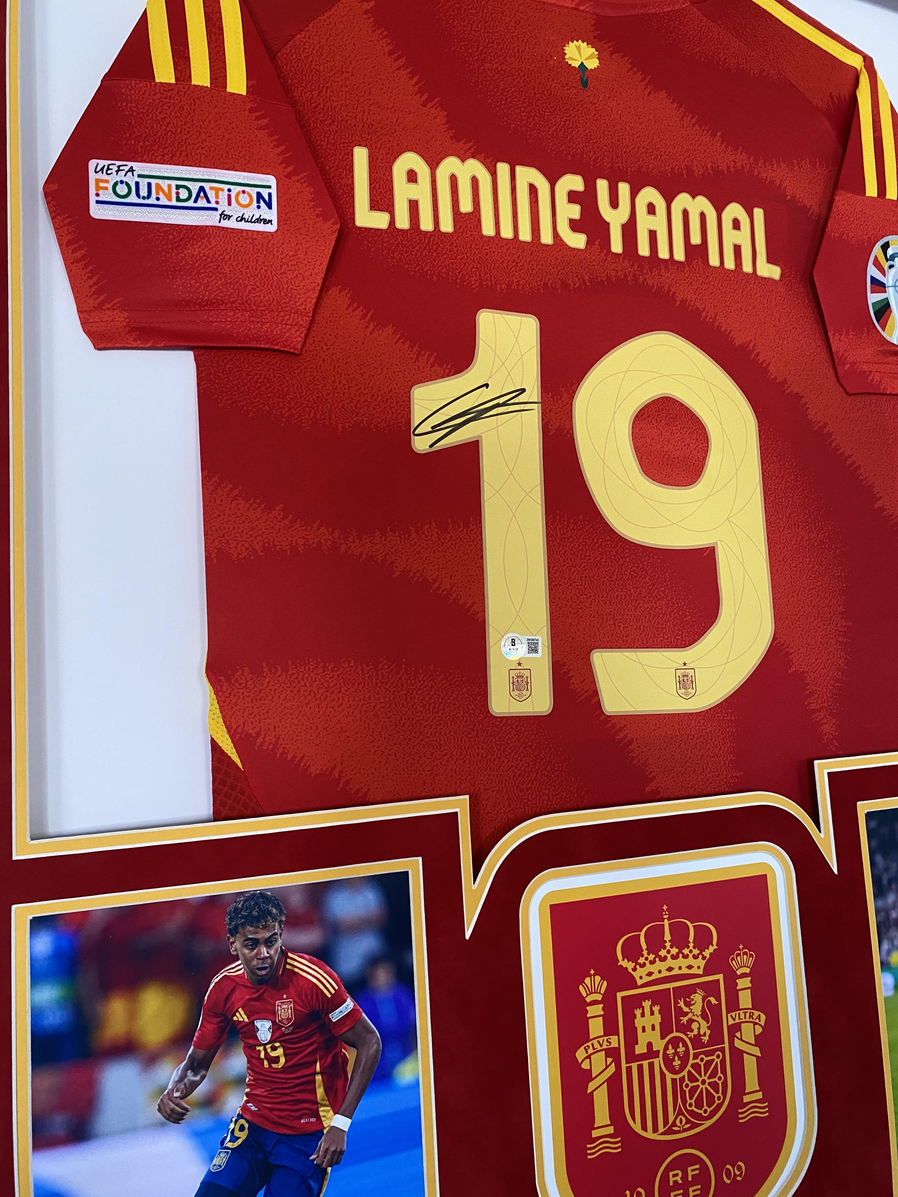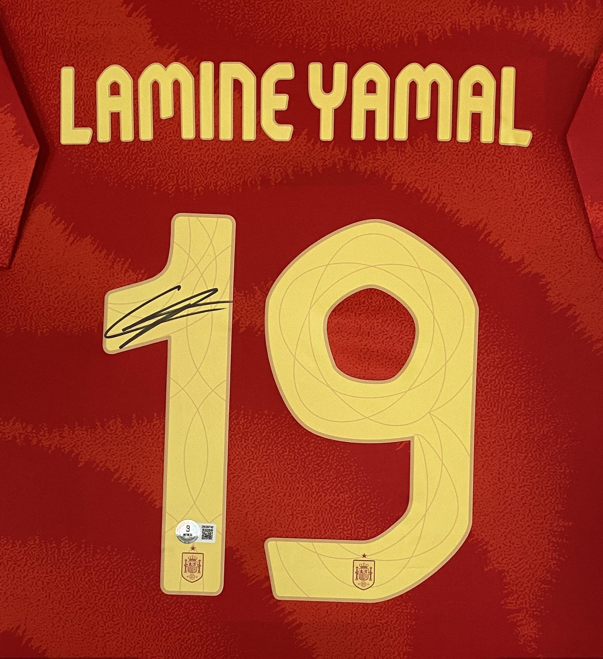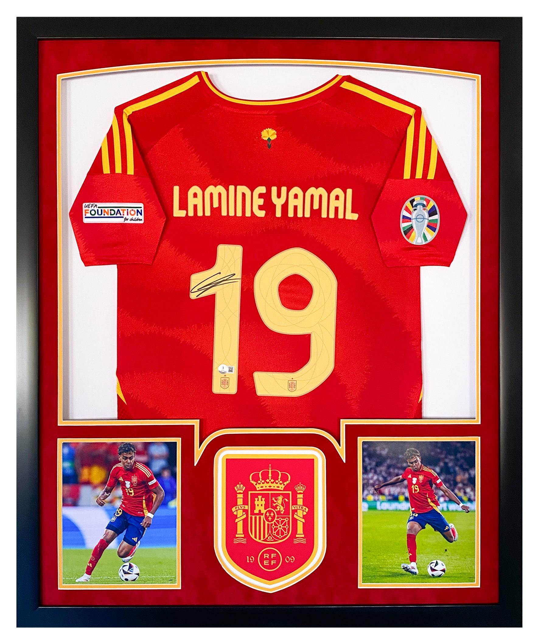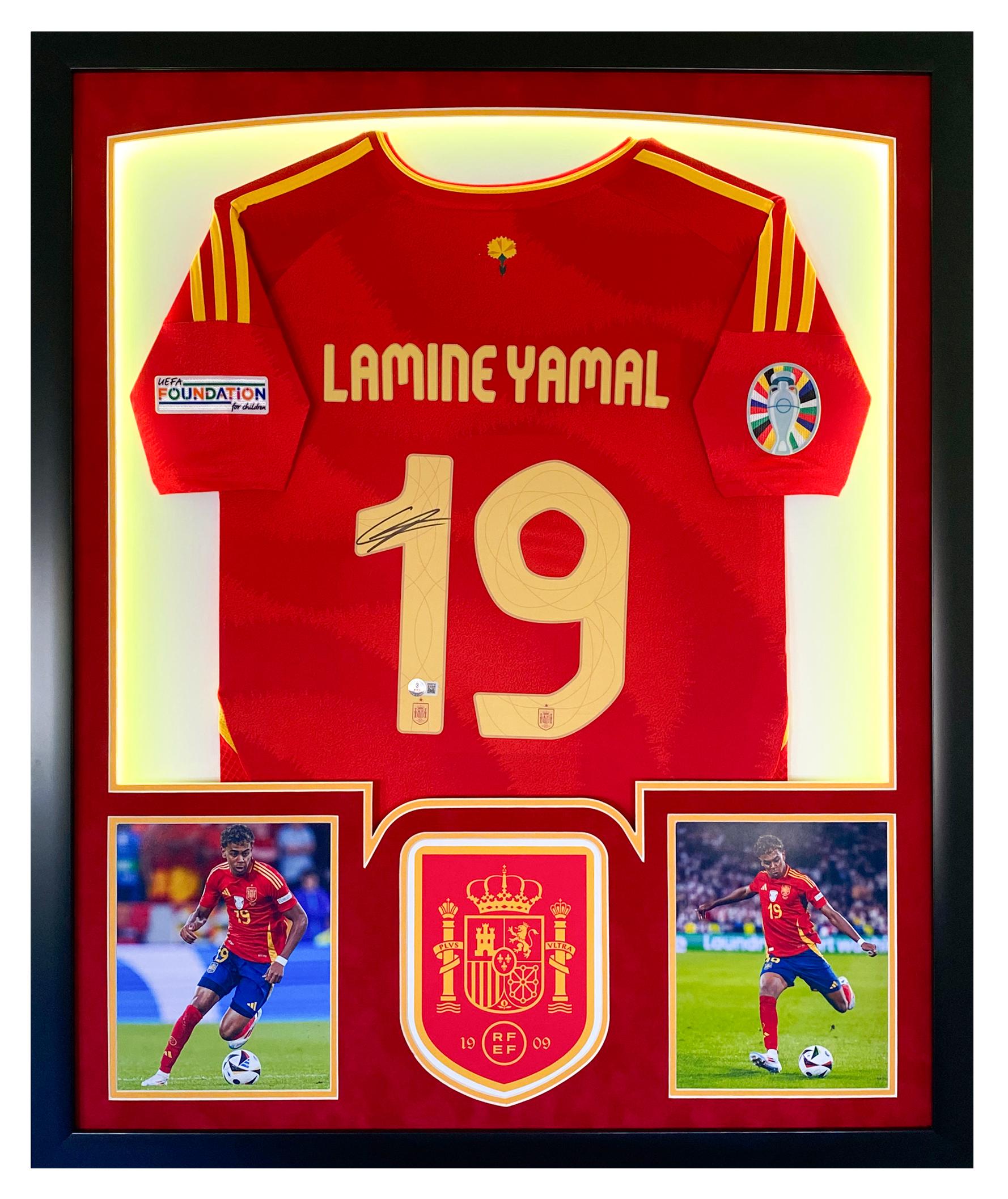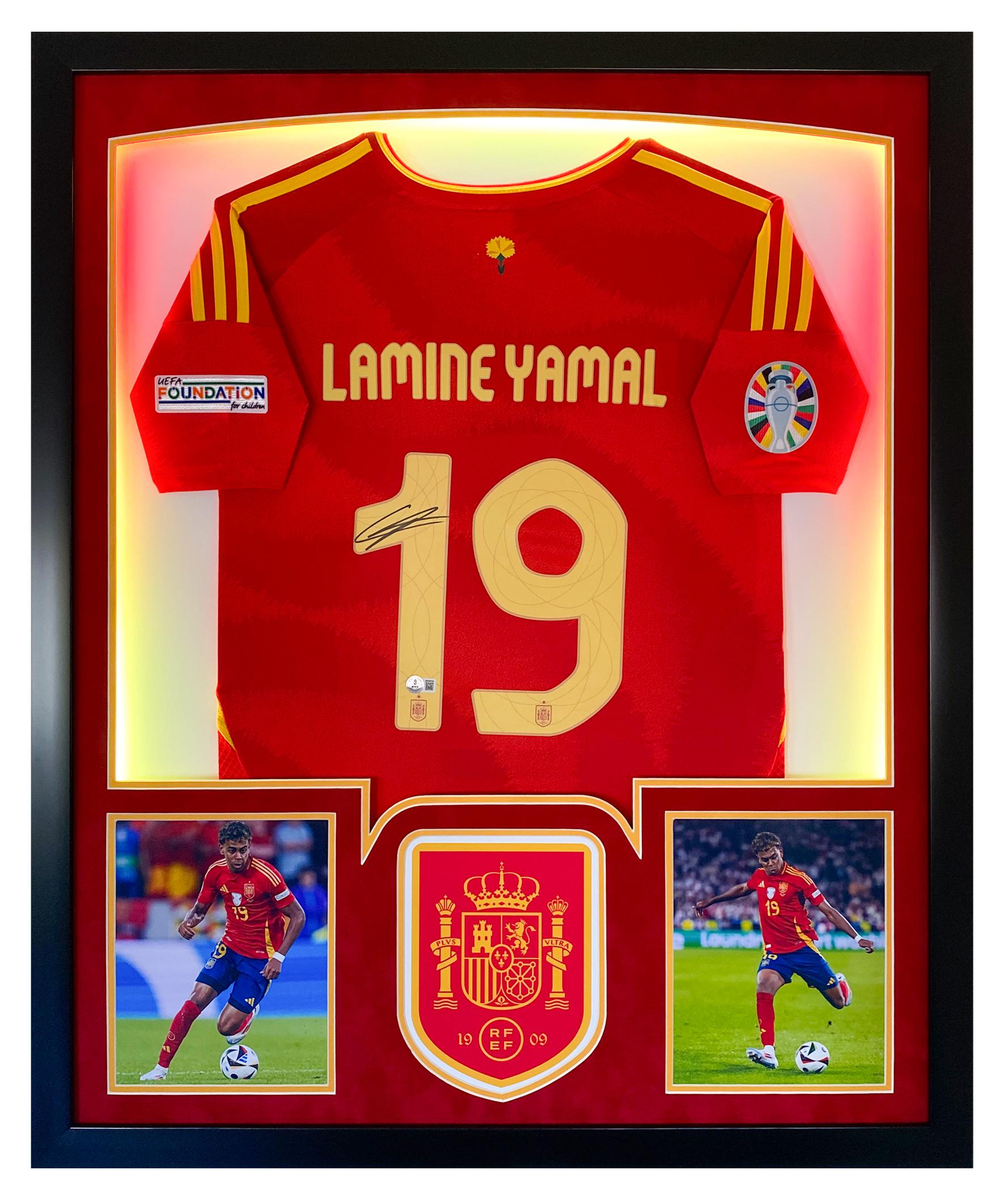 Custom framed display measures 32" x 40" in size and features a jersey that has been hand-signed by Lamine Yamal.