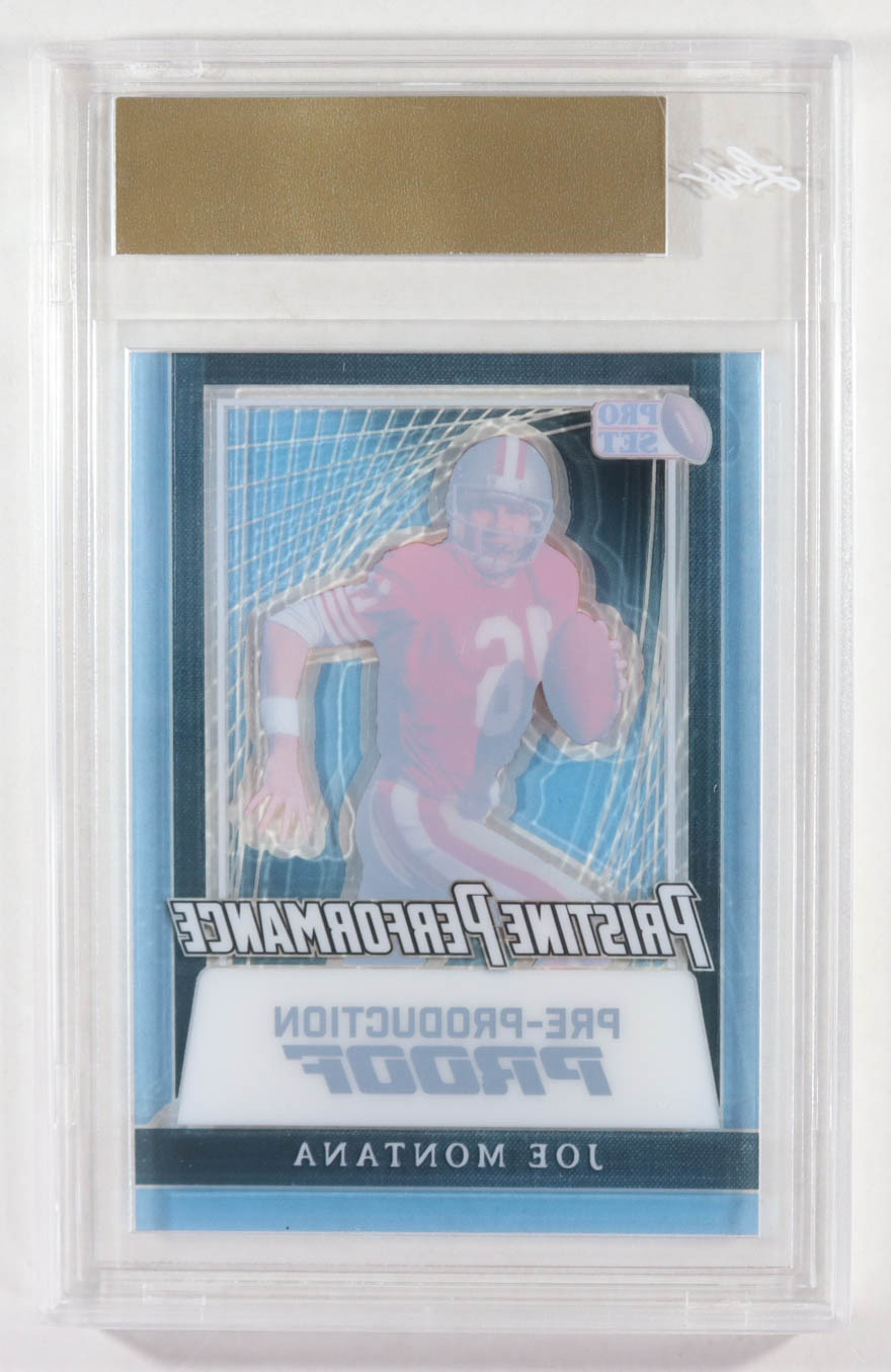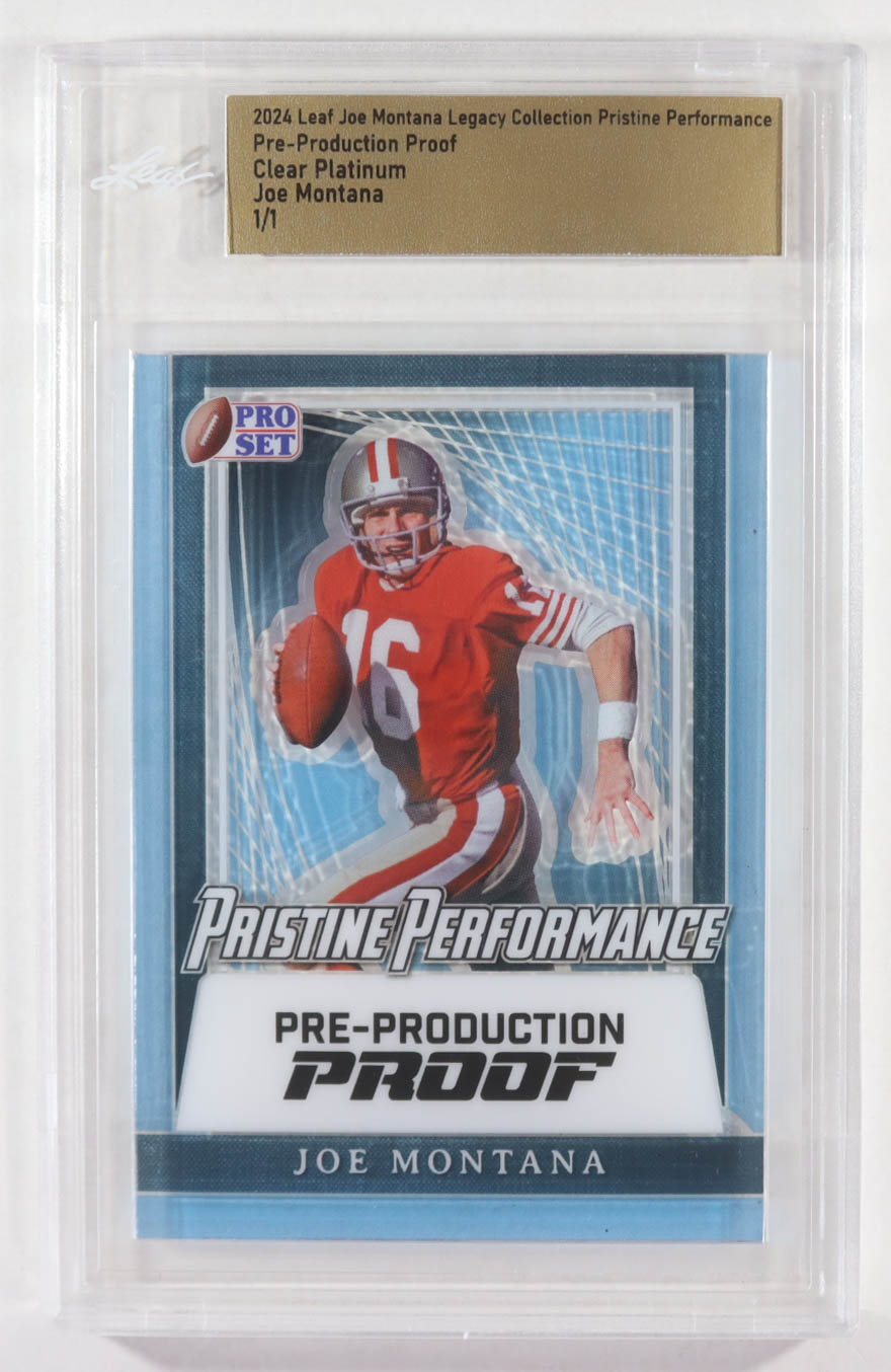 Joe Montana 2024 Leaf Joe Montana Legacy Pristine Performance Pre-Production Proof Clear Platinum #NNO #1/1 (Leaf)