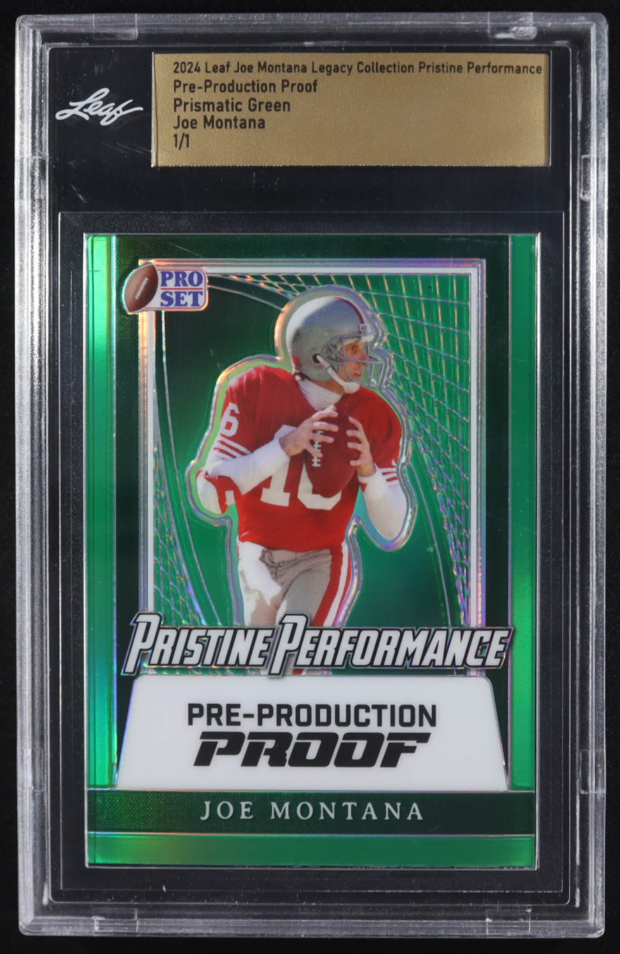 Joe Montana 2024 Leaf Joe Montana Legacy Pristine Performance Pre-Production Proof Prismatic Green #NNO #1/1 (Leaf)