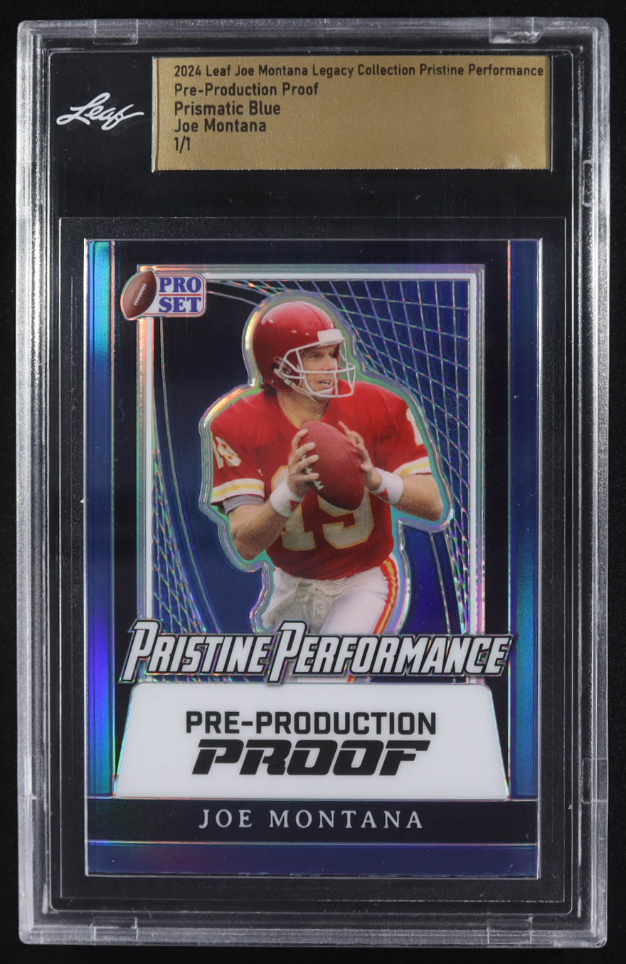Joe Montana 2024 Leaf Joe Montana Legacy Pristine Performance Pre-Production Proof Prismatic Blue #NNO #1/1 (Leaf)