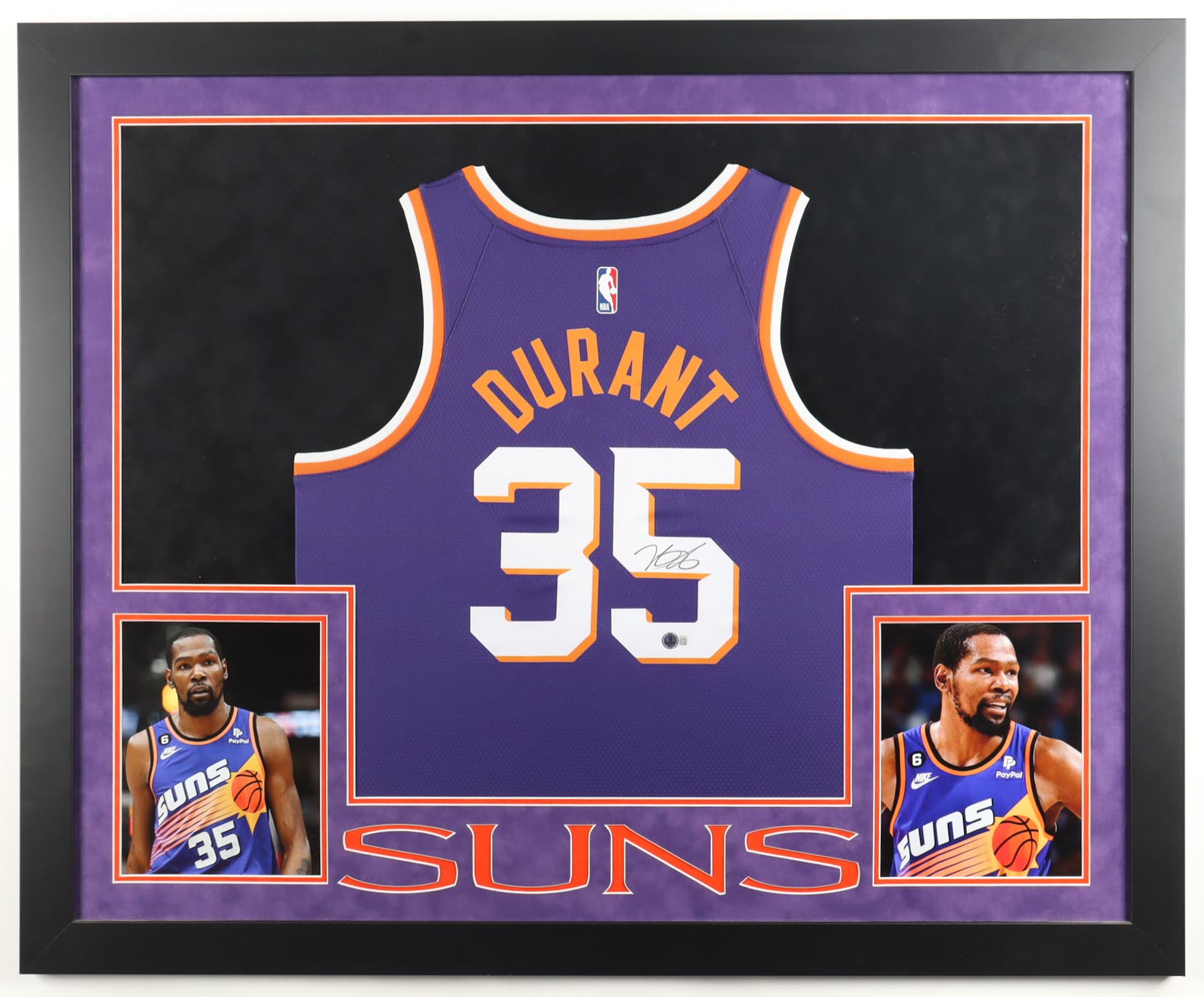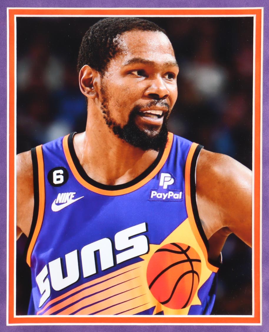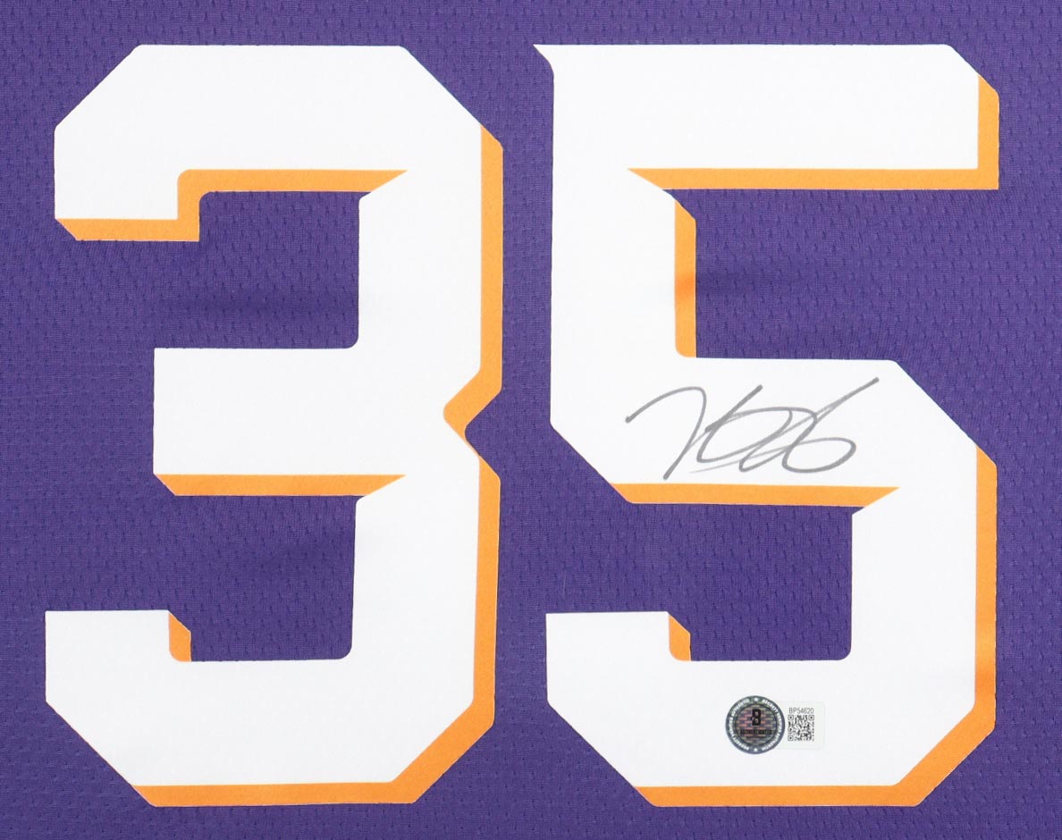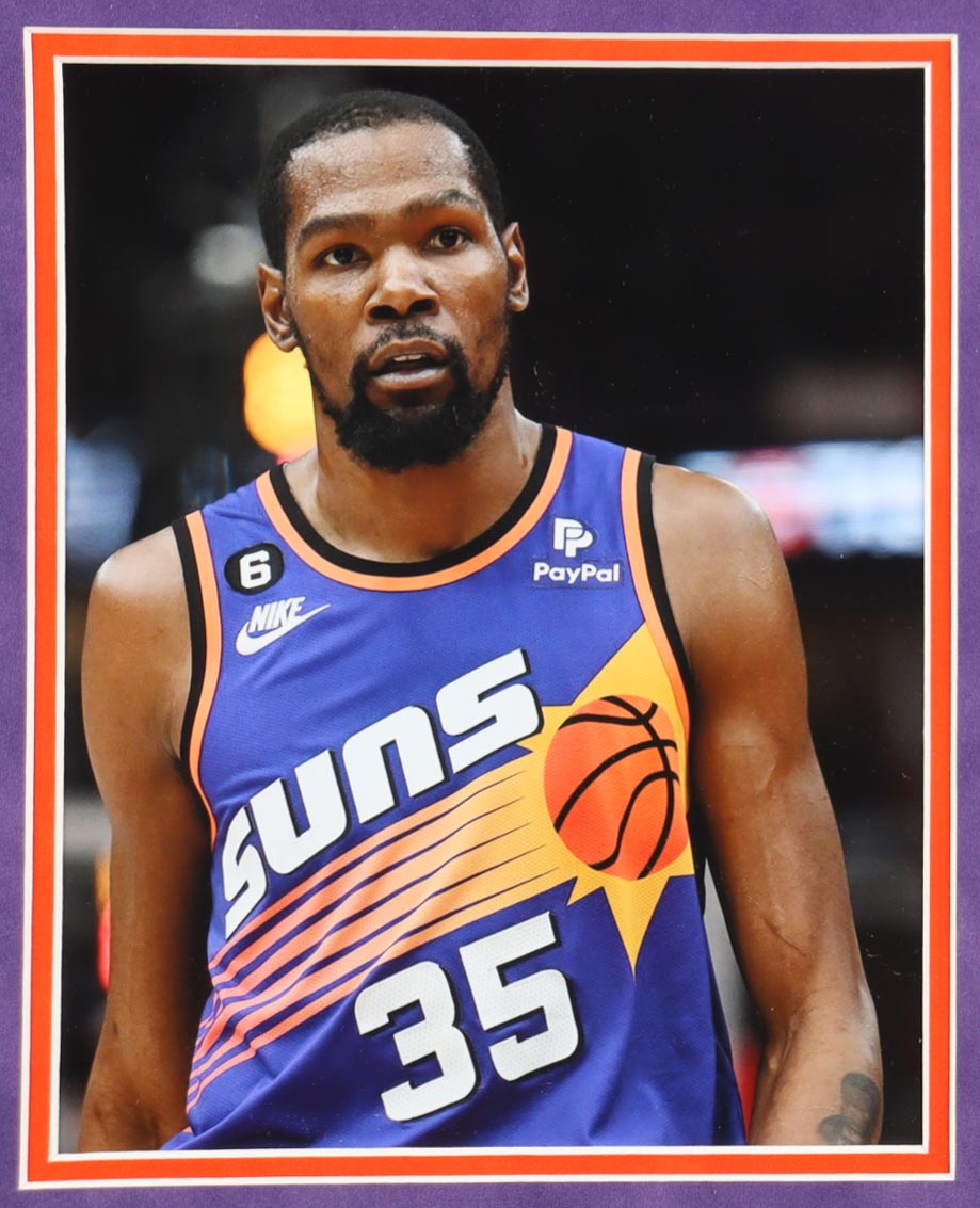 Custom frame measures 35.5" x 43.5" in size. Features a jersey that has been hand-signed by Kevin Durant (Phoenix Suns).