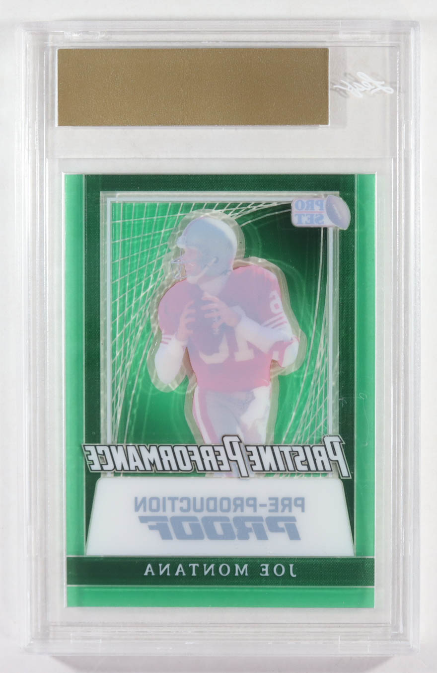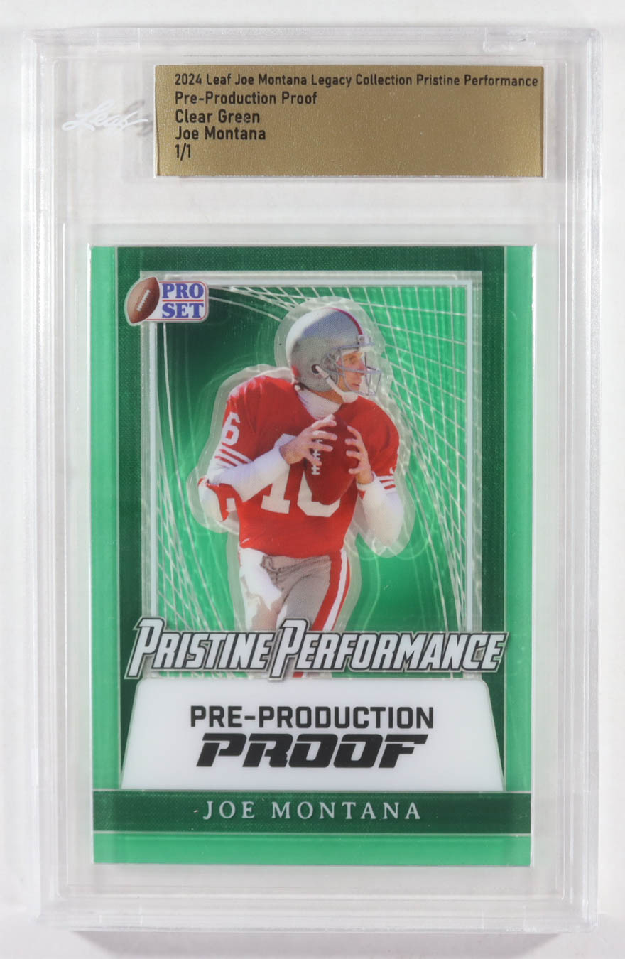 Joe Montana 2024 Leaf Joe Montana Legacy Pristine Performance Pre-Production Proof Clear Green #NNO #1/1 (Leaf)