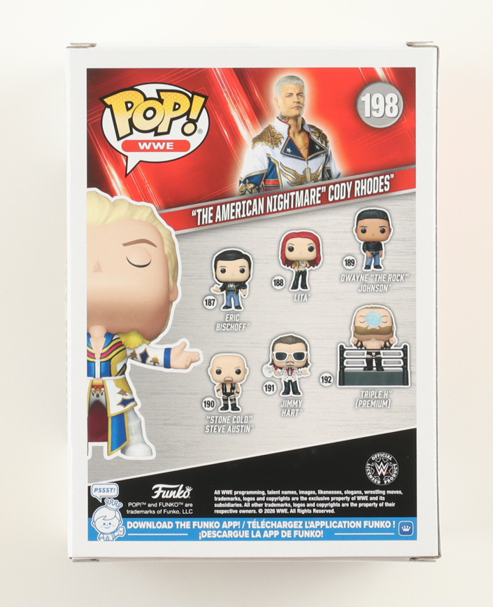 Funko pop! vinyl figure measures approximately 4" tall and has been hand-signed on the packaging by Cody 'The American Nightmare' Rhodes. Please note, the window has been swapped.