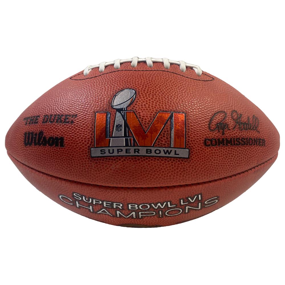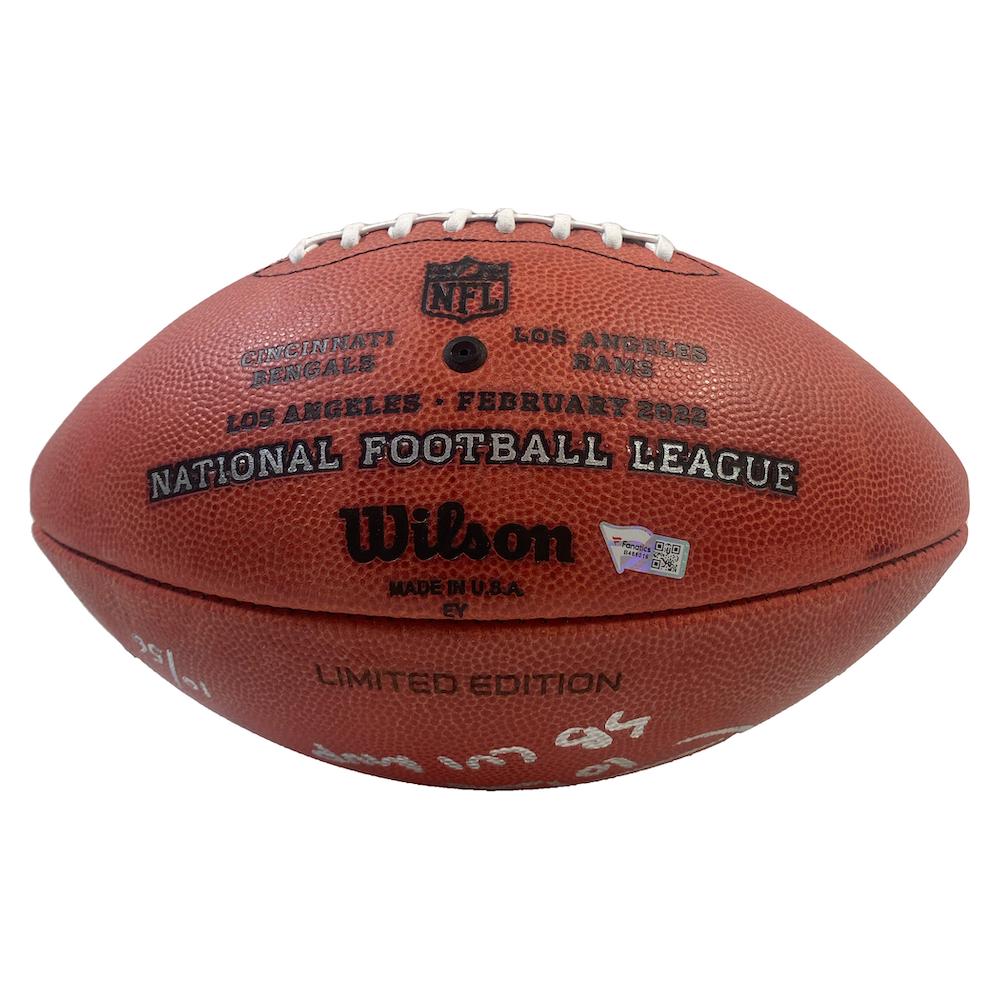 Wilson Official "The Duke" Super Bowl LVI logo football has been hand-signed and inscribed by Cooper Kupp (Los Angeles Rams). Item is limited edition and hand-numbered #10/56.