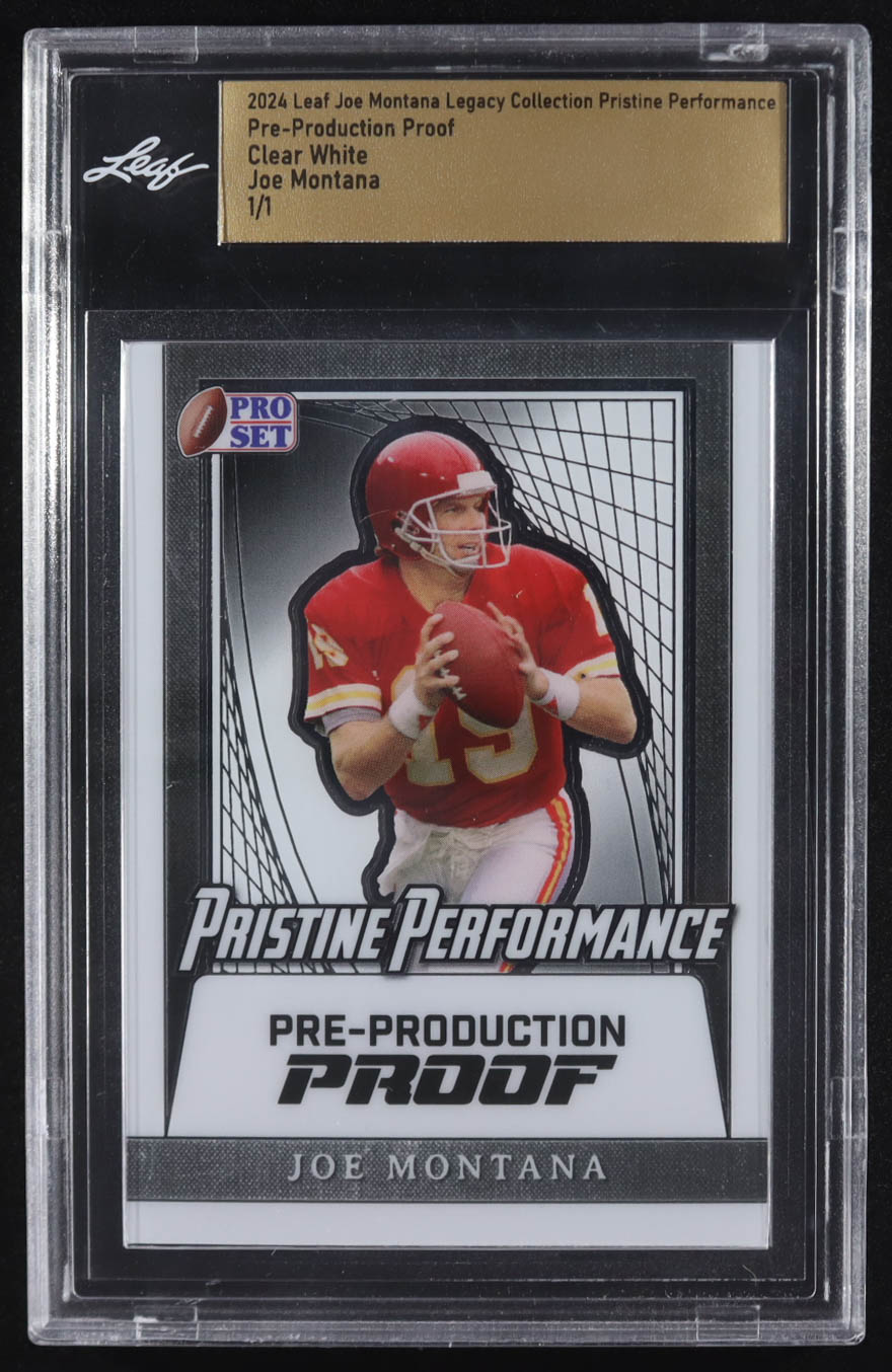 Joe Montana 2024 Leaf Joe Montana Legacy Pristine Performance Pre-Production Proof Clear White #NNO #1/1 (Leaf)