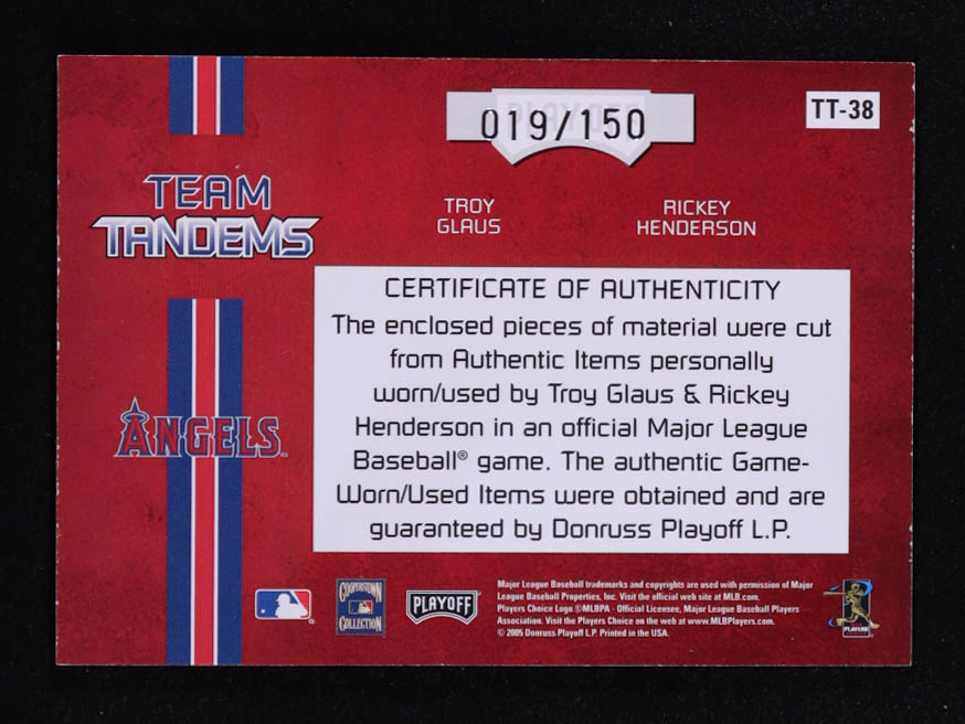 Troy Glaus / Rickey Henderson 2005 Absolute Memorabilia Team Tandems Swatch Single #TT38 #019/150