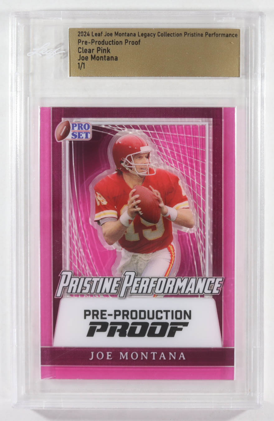 Joe Montana 2024 Leaf Joe Montana Legacy Pristine Performance Pre-Production Proof Clear Pink #NNO #1/1 (Leaf)