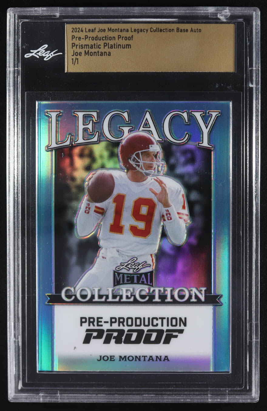 Joe Montana 2024 Leaf Joe Montana Legacy Base Auto Pre-Production Proof Prismatic Platinum #NNO #1/1 (Leaf)