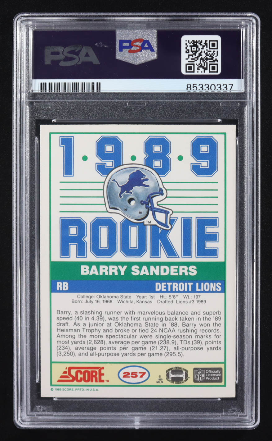 Barry Sanders Signed 1989 Score #257 RC (PSA | Auto Grade 10)