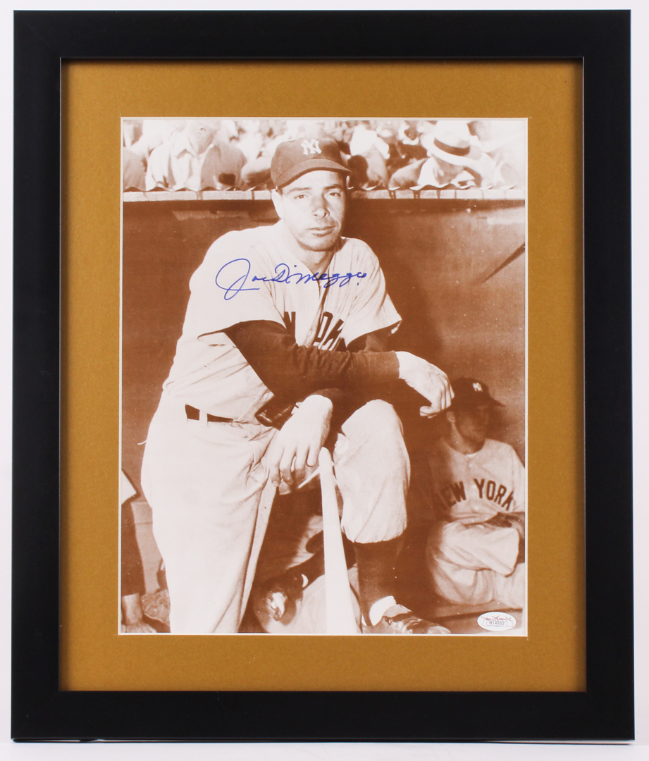 Custom framed display measures 16" x 19" in size and features a photo that has been hand-signed by Joe DiMaggio (D. 1999, New York Yankees, HOF).