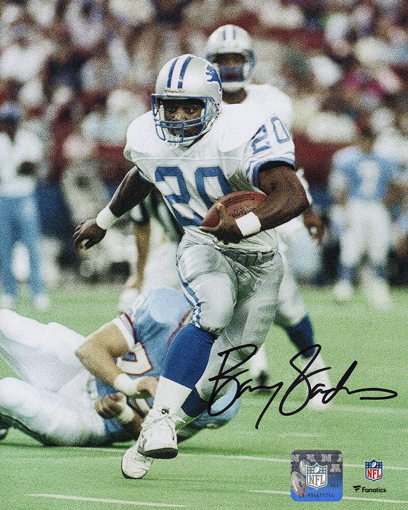 Photo measures 8” x 10” in size and has been hand-signed by Barry Sanders (Detroit Lions, HOF).