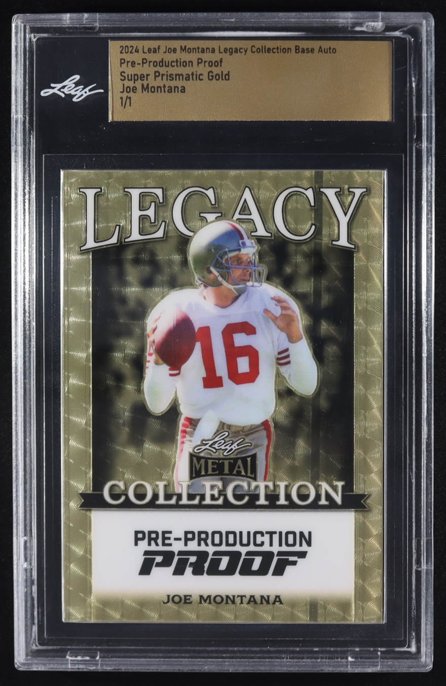 Joe Montana 2024 Leaf Joe Montana Legacy Base Auto Pre-Production Proof Super Prismatic Gold #NNO #1/1 (Leaf)