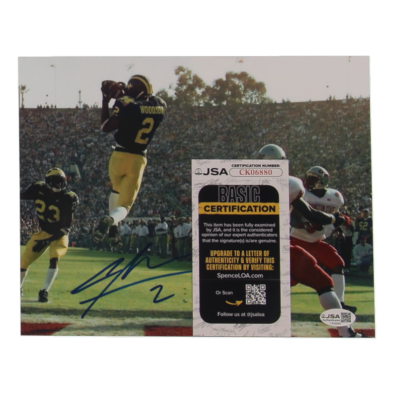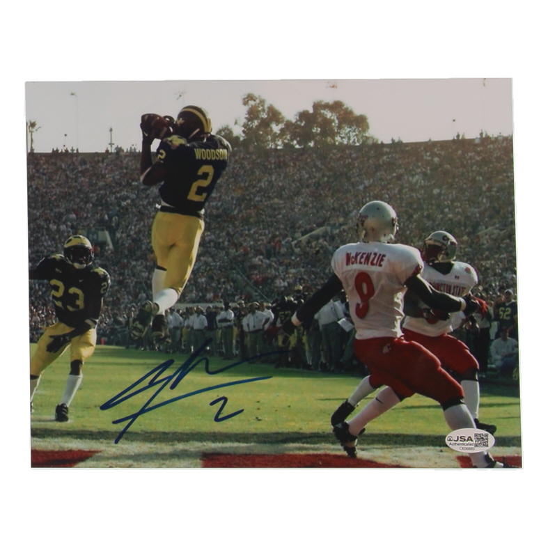 Photo measures 8" x 10" in size and has been hand-signed by Charles Woodson (Michigan Wolverines, HOF).