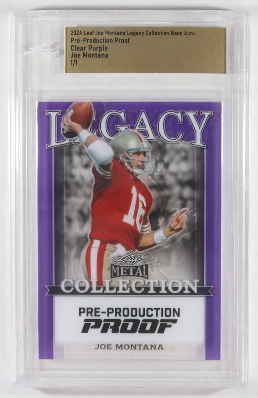 Joe Montana 2024 Leaf Joe Montana Legacy Base Auto Pre-Production Proof Clear Purple #NNO #1/1 (Leaf)