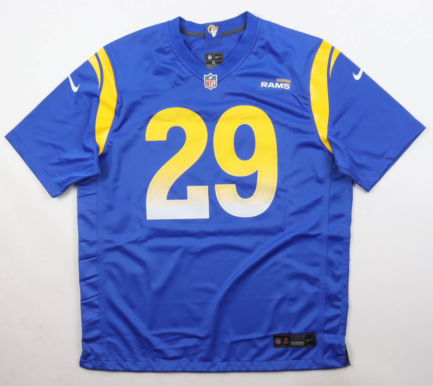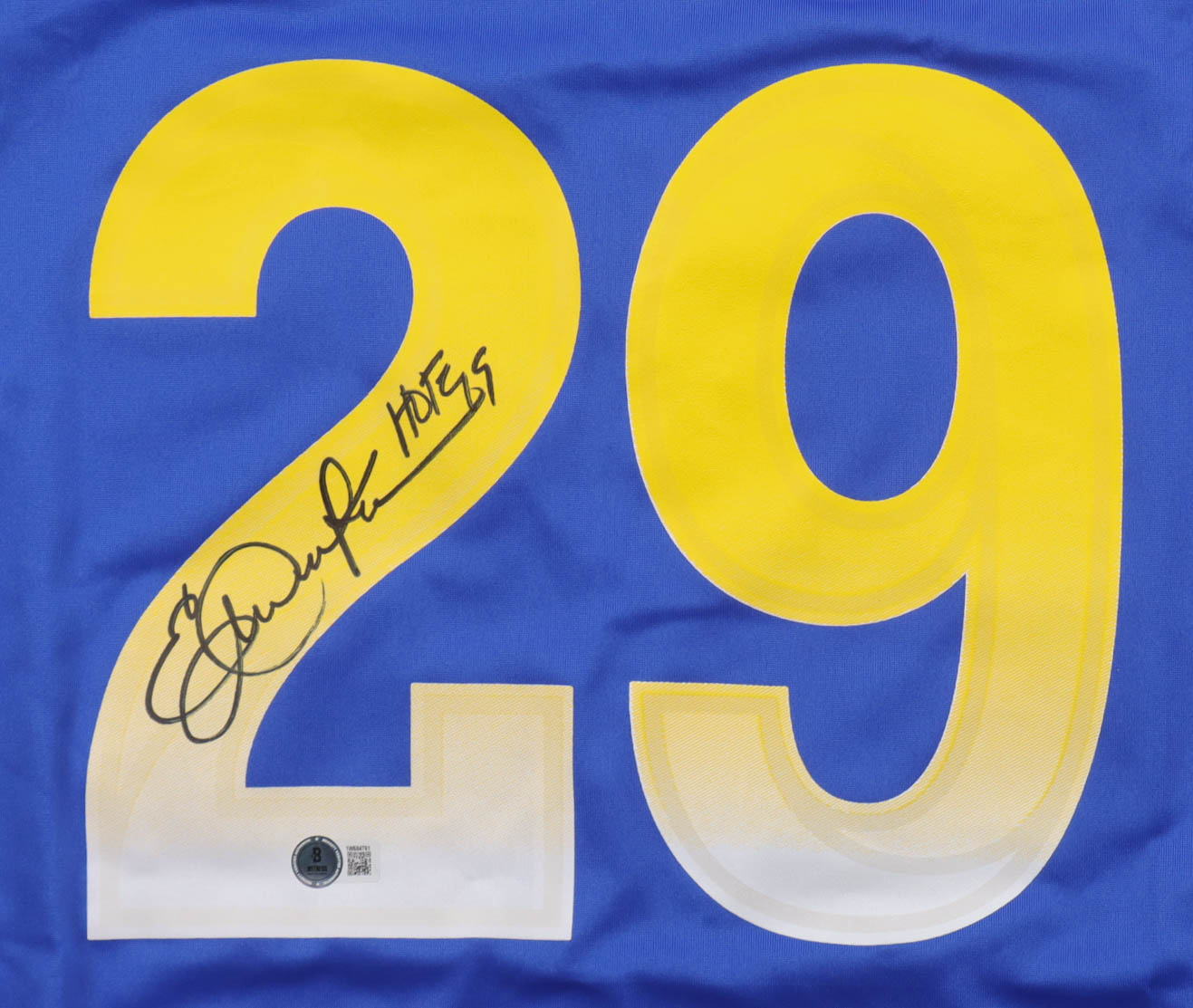 Nike jersey with everything pressed on, size XL. Hand-signed and inscribed by Eric Dickerson (Los Angeles Rams, HOF).