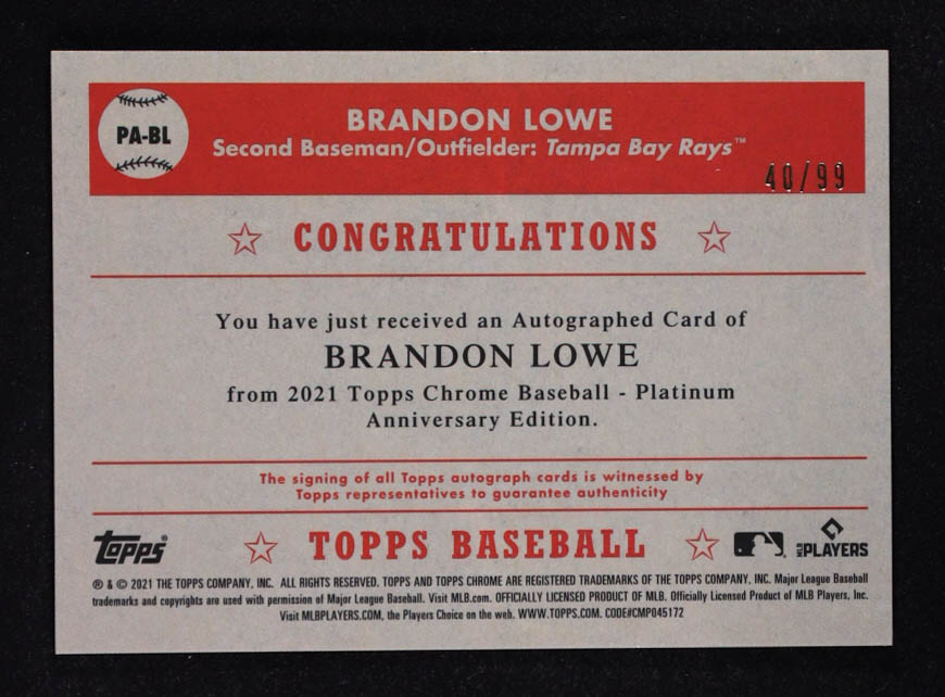 Brandon Lowe 2021 Topps Chrome Platinum Anniversary Autographs Blue Prism Refractors #PABL #40/99