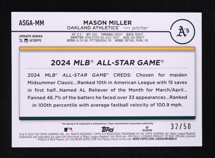 Mason Miller 2024 Topps Update '24 MLB All-Star Game Autographs Gold #ASGAMM #32/50