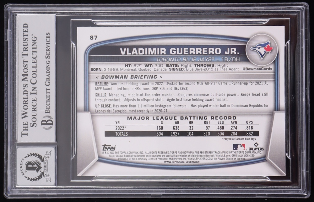 Vladimir Guerrero Jr. Signed 2023 Bowman #87 (BGS | Auto Grade 10)