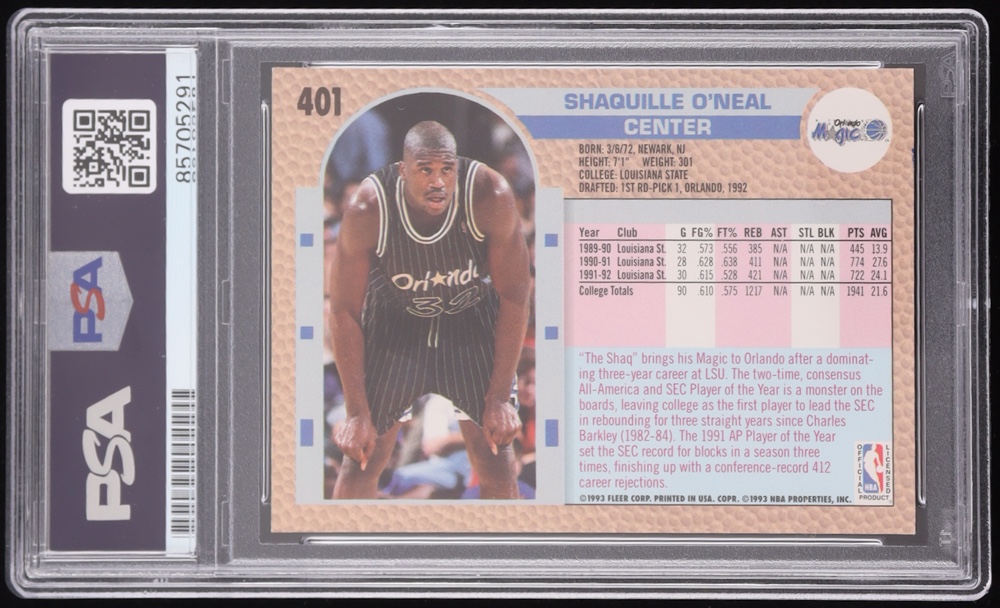 Shaquille O'Neal Signed 1992-93 Fleer #401 RC (PSA | Auto 10)