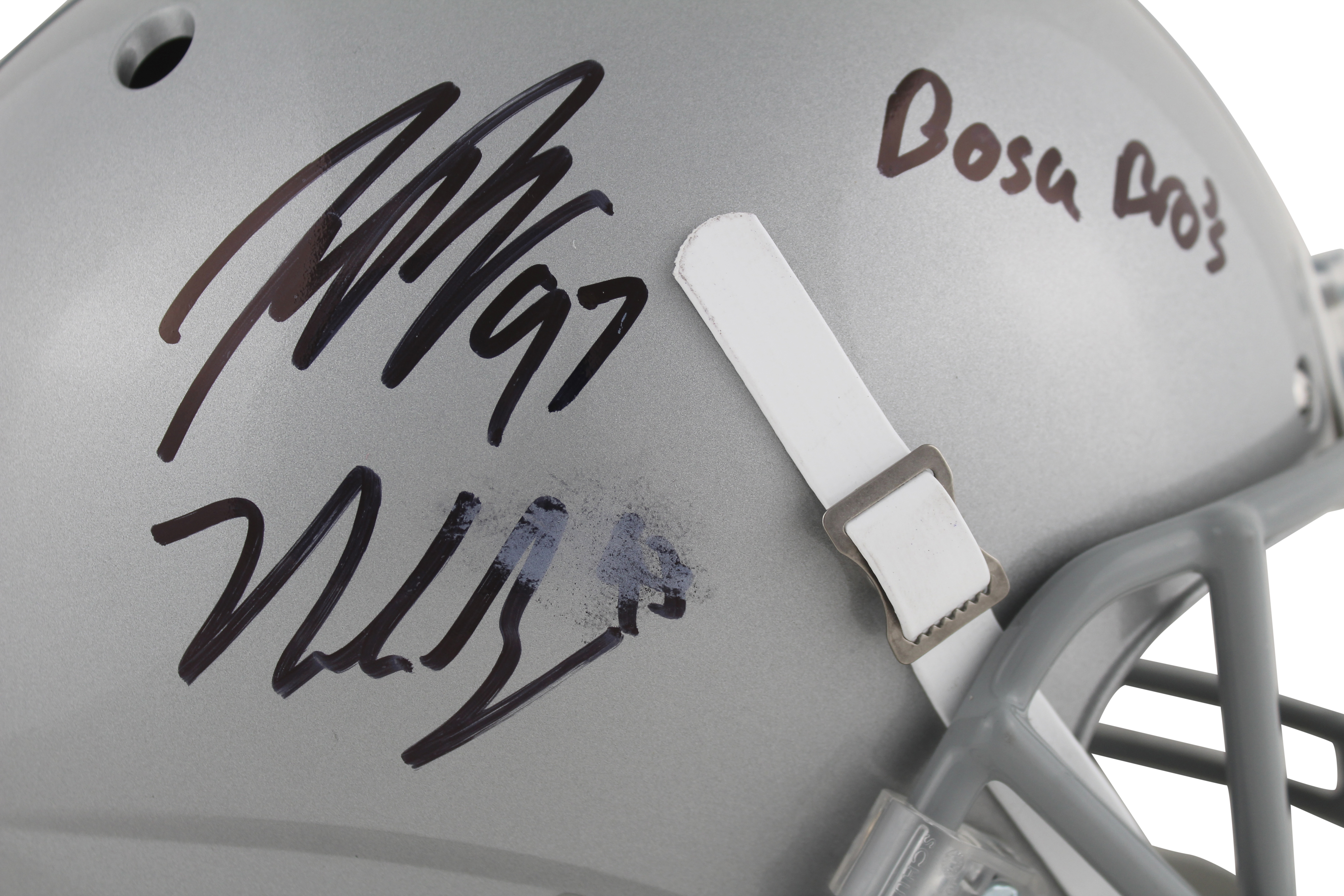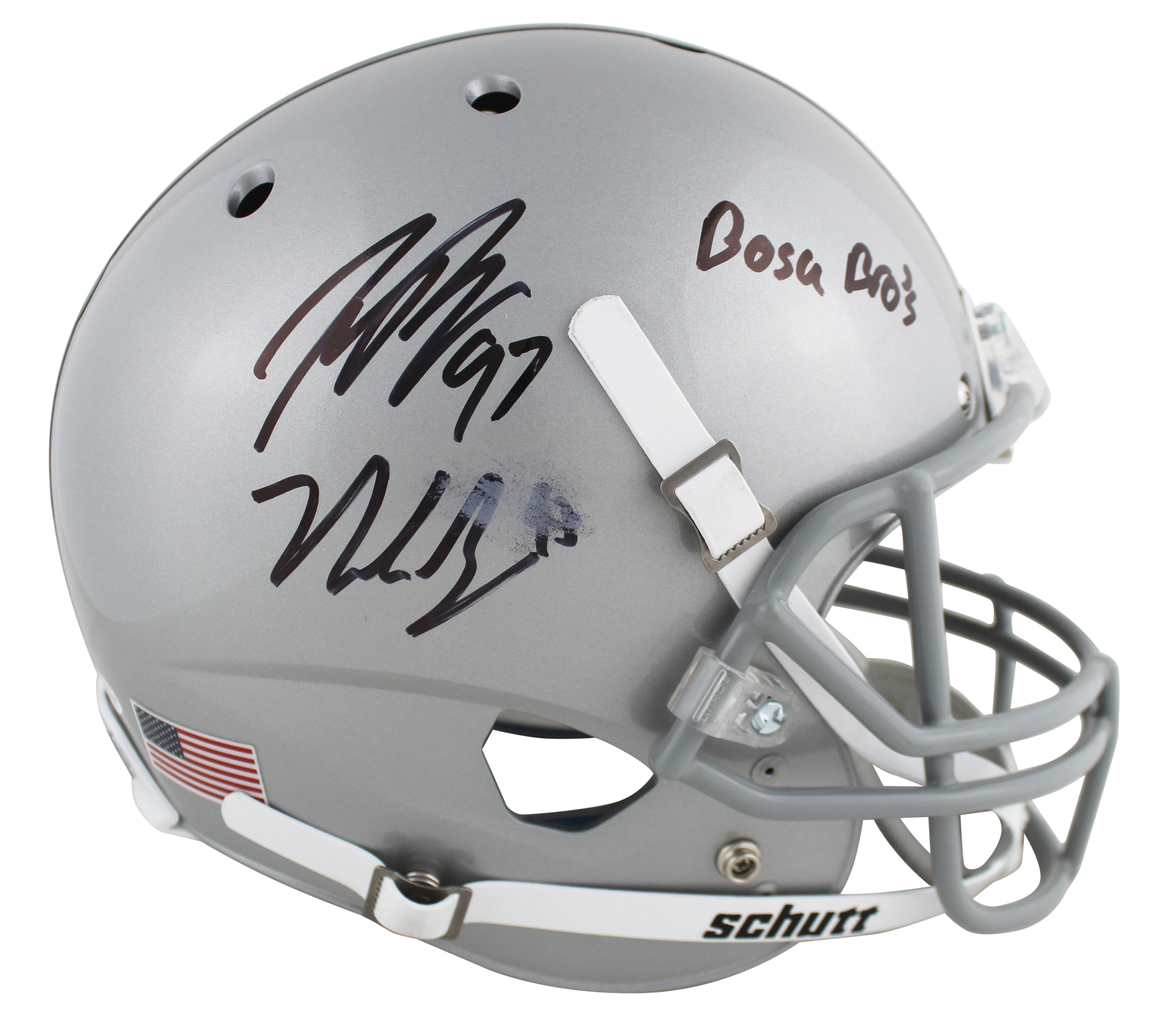 Schutt Ohio State Buckeyes full-size replica helmet. Hand-signed and inscribed by Nick Bosa and Joey Bosa.