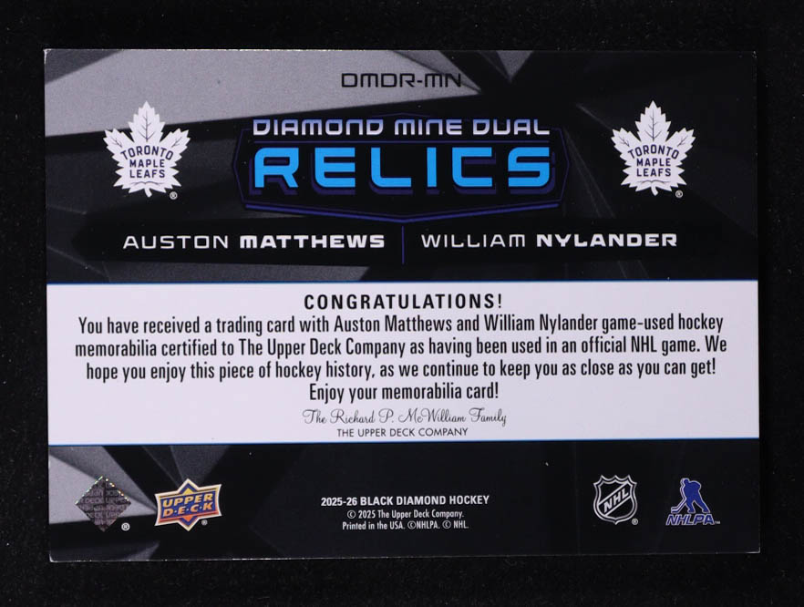 Auston Matthews / William Nylander 2025-26 Black Diamond Diamond Mine Dual Relics #DMDRMN