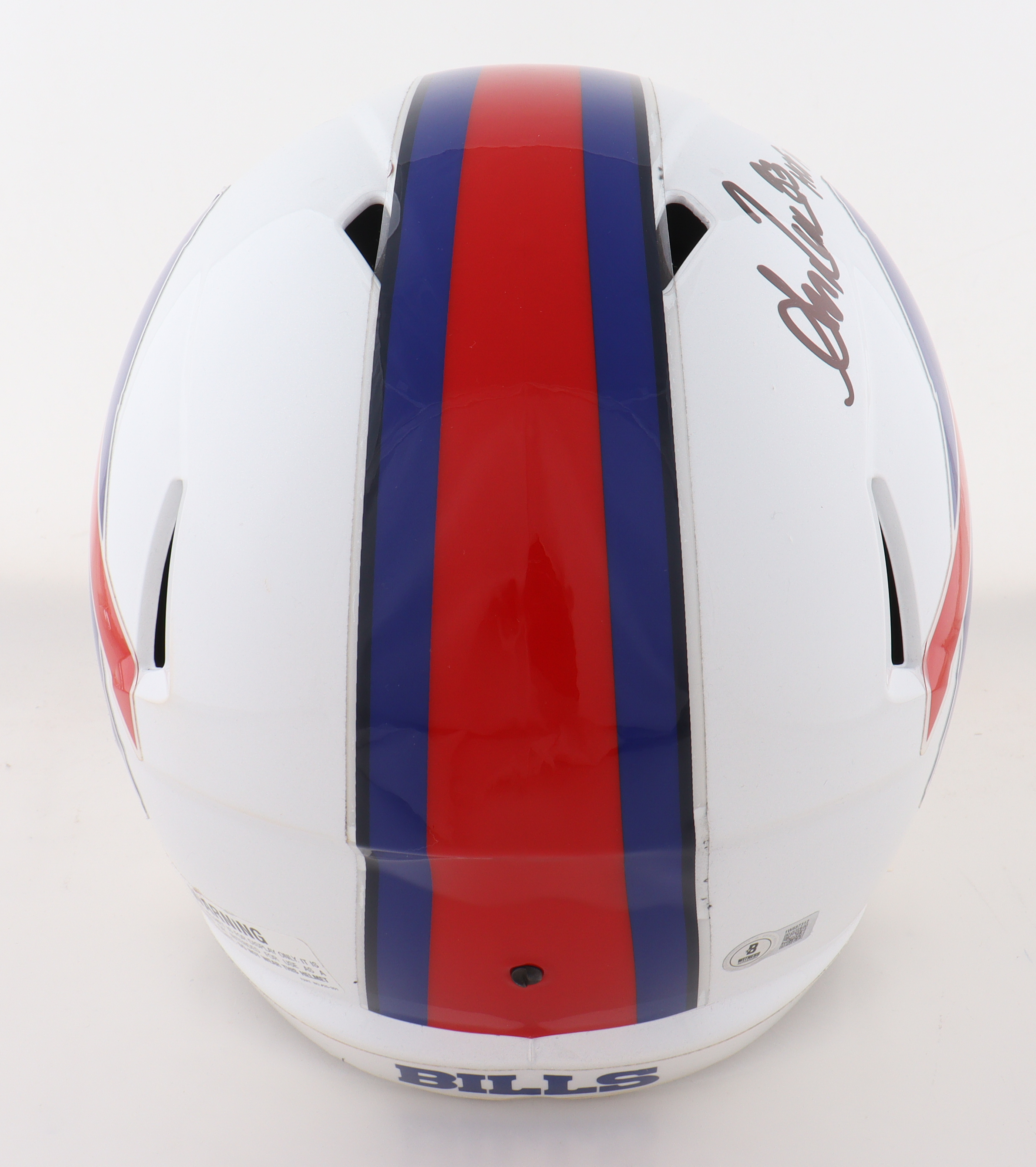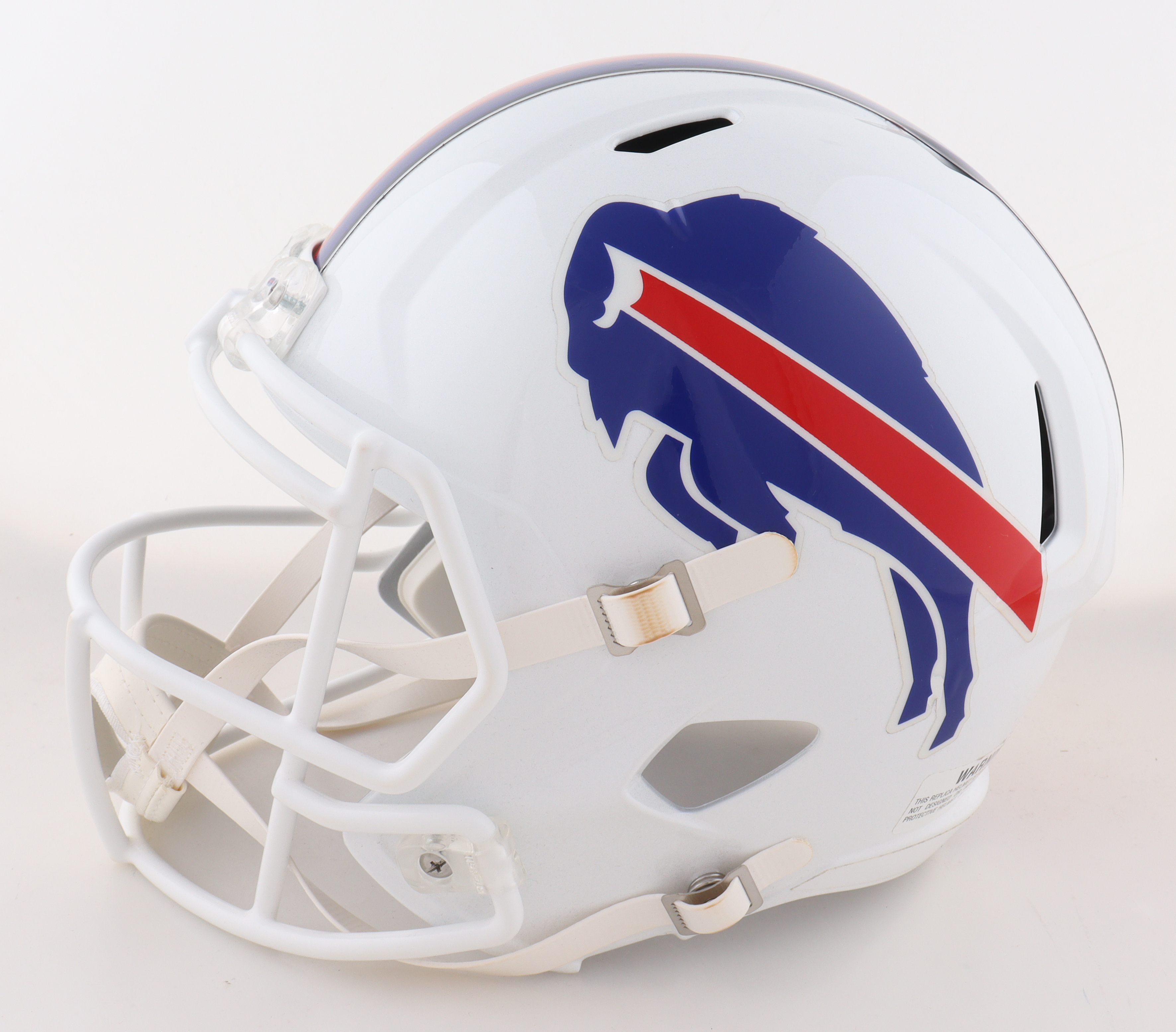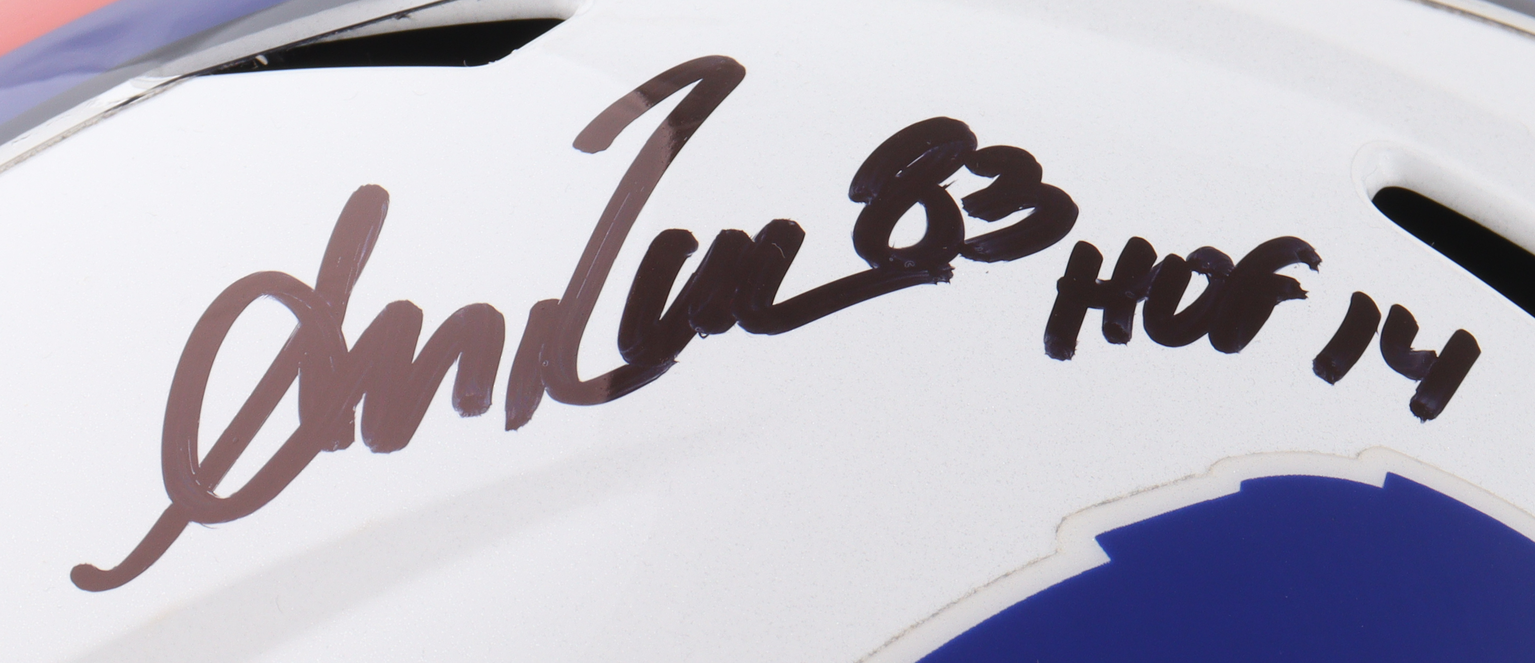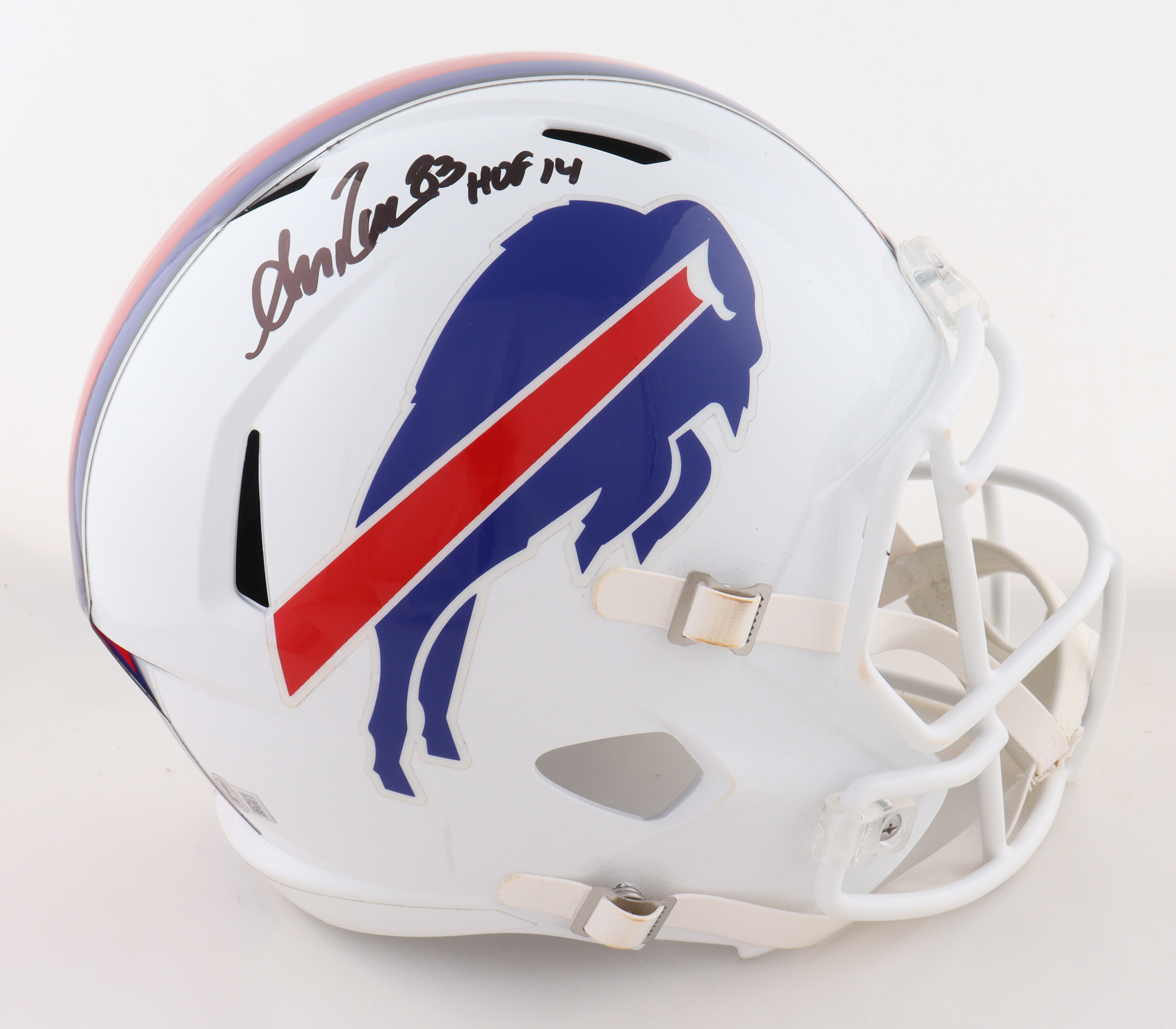 Riddell Buffalo Bills full-size speed replica helmet has been hand-signed and inscribed by Andre Reed (HOF). Please note the yellowing on the strap.