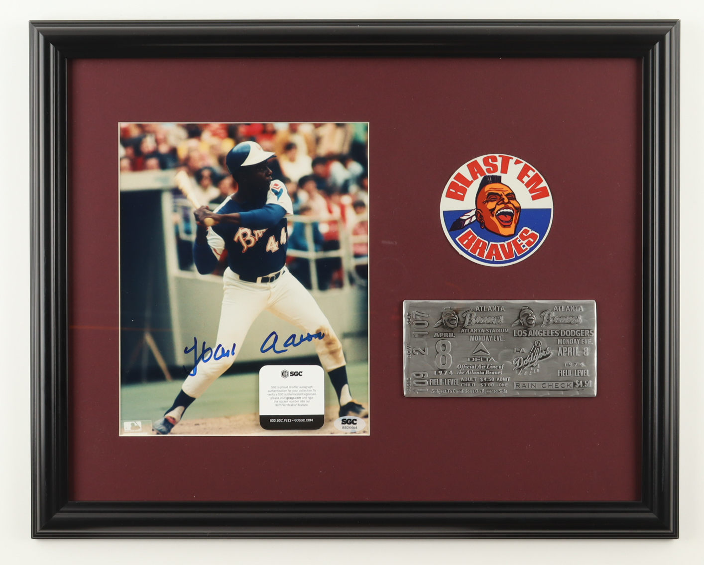 Hank Aaron Signed Braves Custom Framed Photo Display with Braves Logo Decal & Pewter Home Run Ticket (SGC)