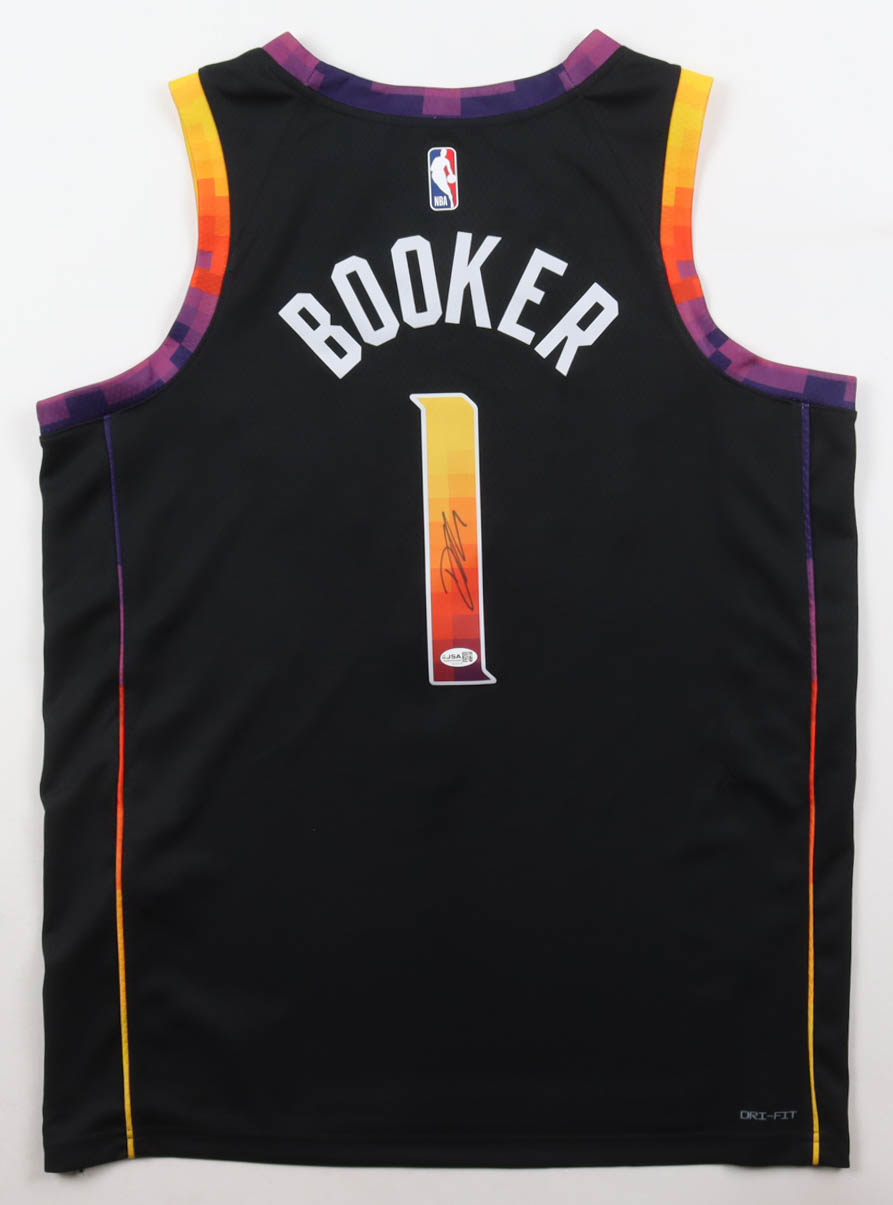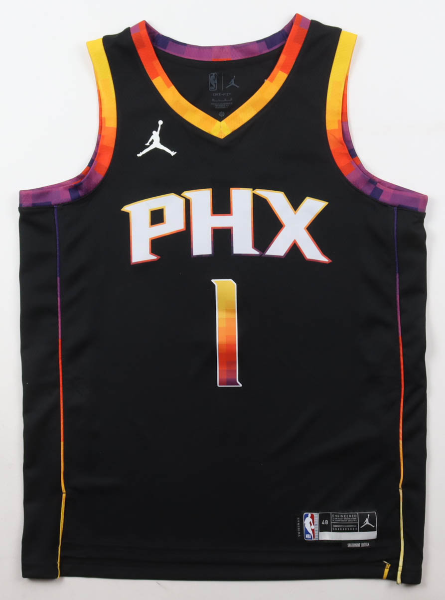 Jordan authentic jersey with everything pressed on, size 48. Hand-signed by Devin Booker (Phoenix Suns).