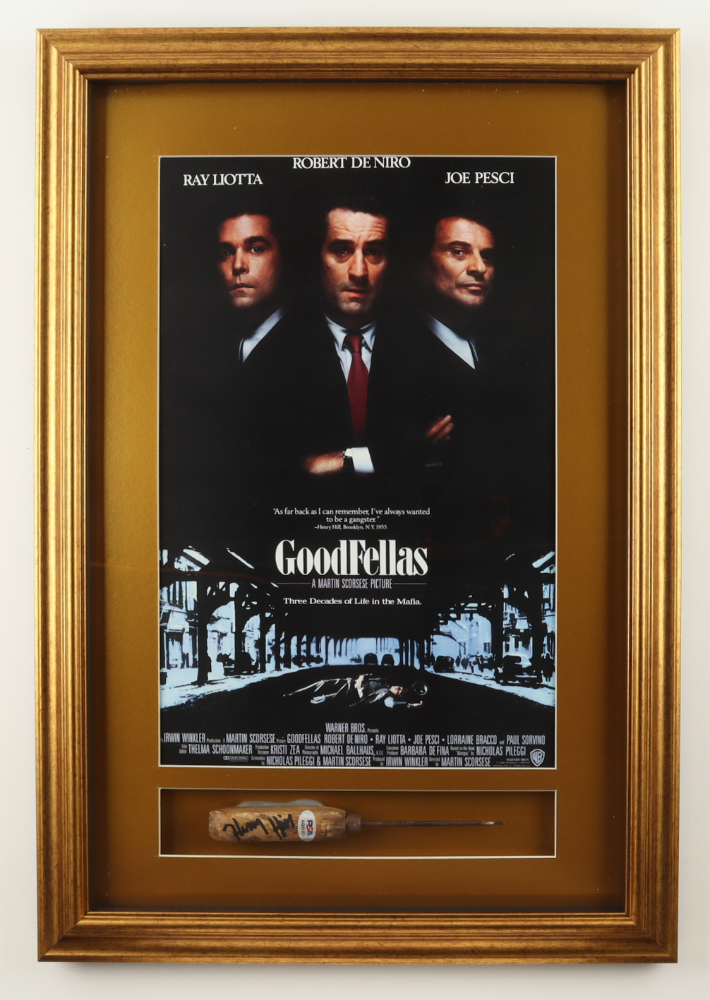 Custom frame measures approximately 17" x 27" in size and features an ice pick that has been hand-signed by Henry Hill (D. 2012). Display also features movie poster. Please refer to photos for more details regarding the condition of the item.