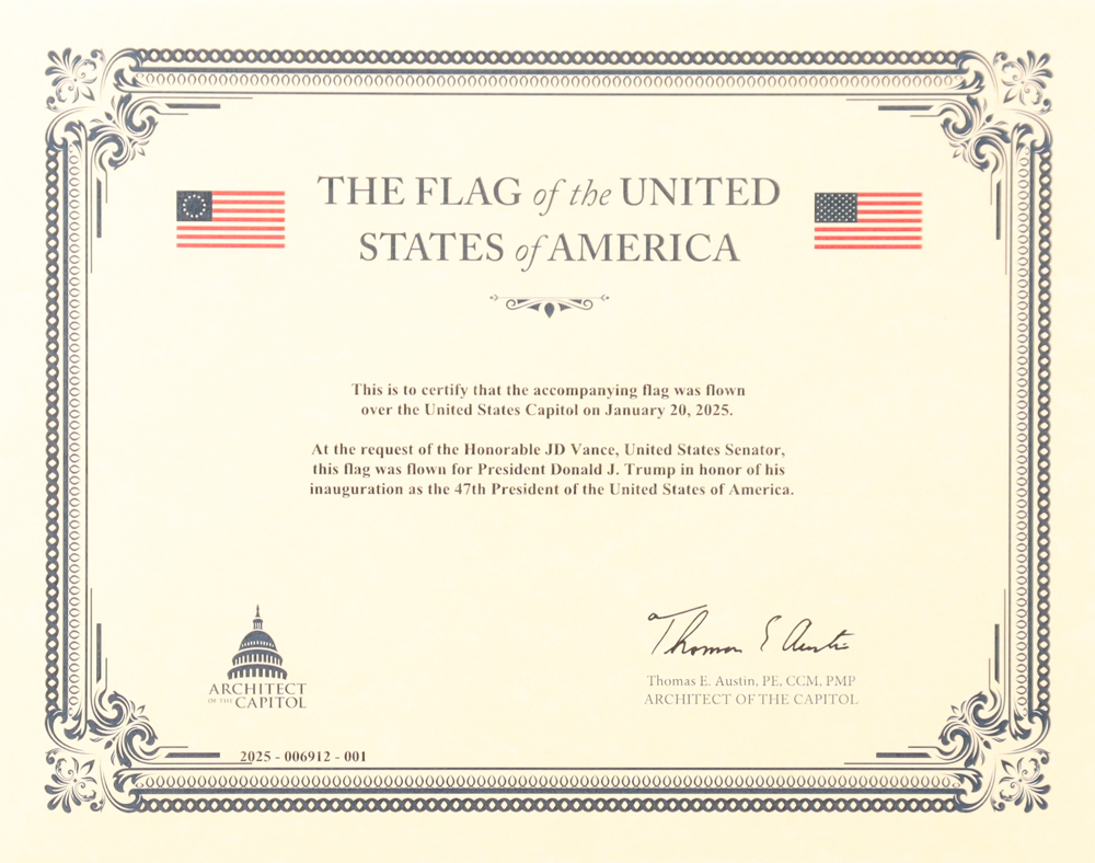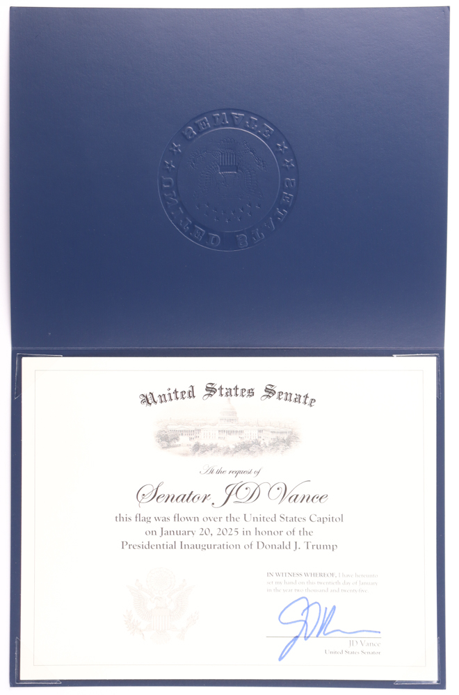 American Flag was flown over the United States Capitol on January 20th, 2025. At the request of the Honorable JD Vance, the United States Senator, this flag was flown to commemorate President Donald J. Trump's Official Inauguration as the 47th President of the United States.