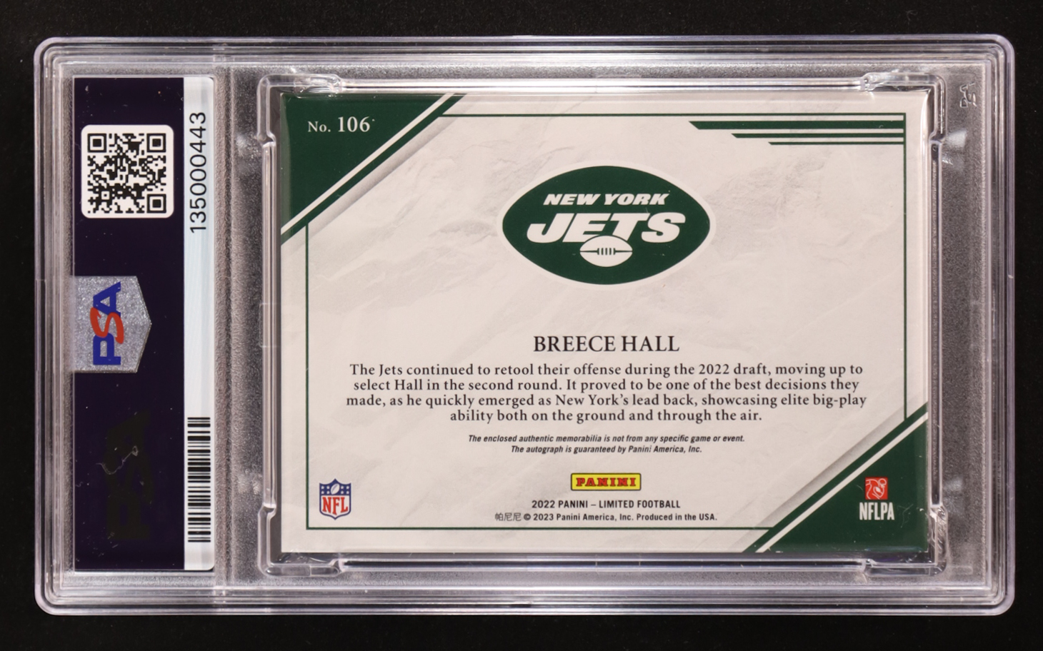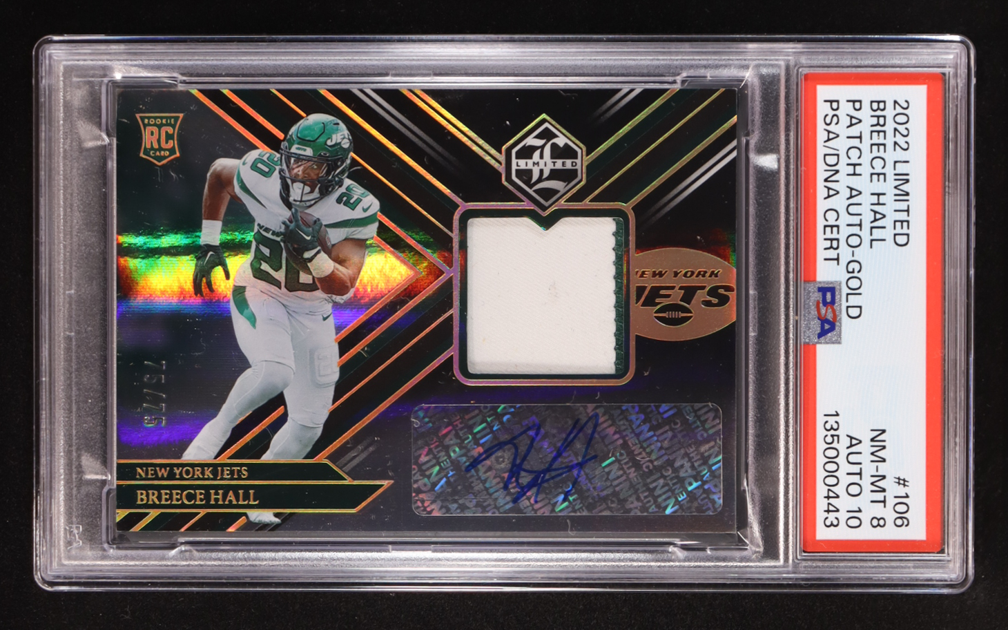 Breece Hall 2022 Panini Limited Patch Gold Auto #106 RC #75/75 (PSA 8 | Autograph Graded PSA 10)