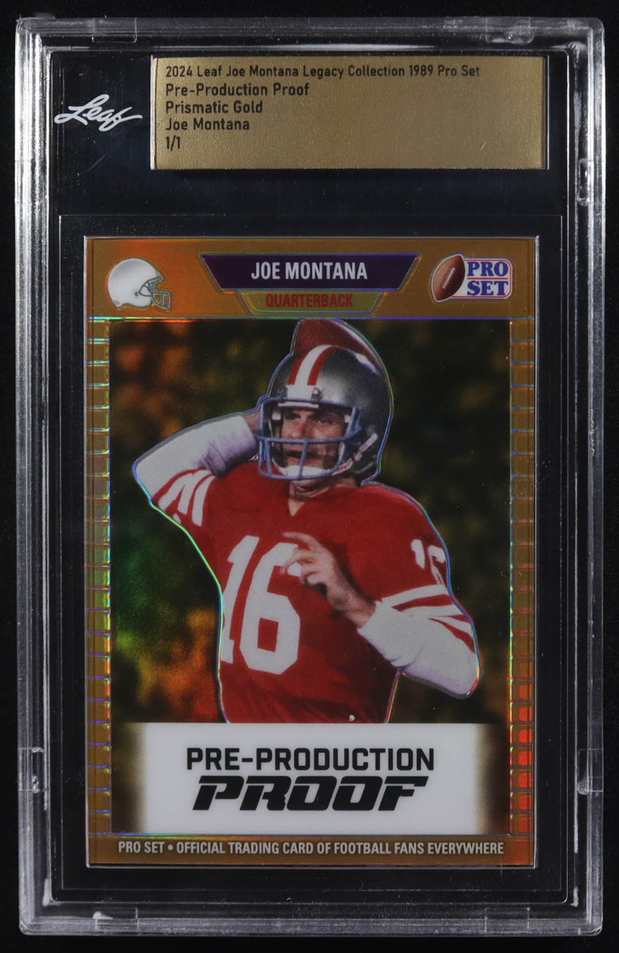 Joe Montana 2024 Leaf Joe Montana Legacy 1989 Pro Set Pre-Production Proof Prismatic Gold #NNO #1/1 (Leaf)