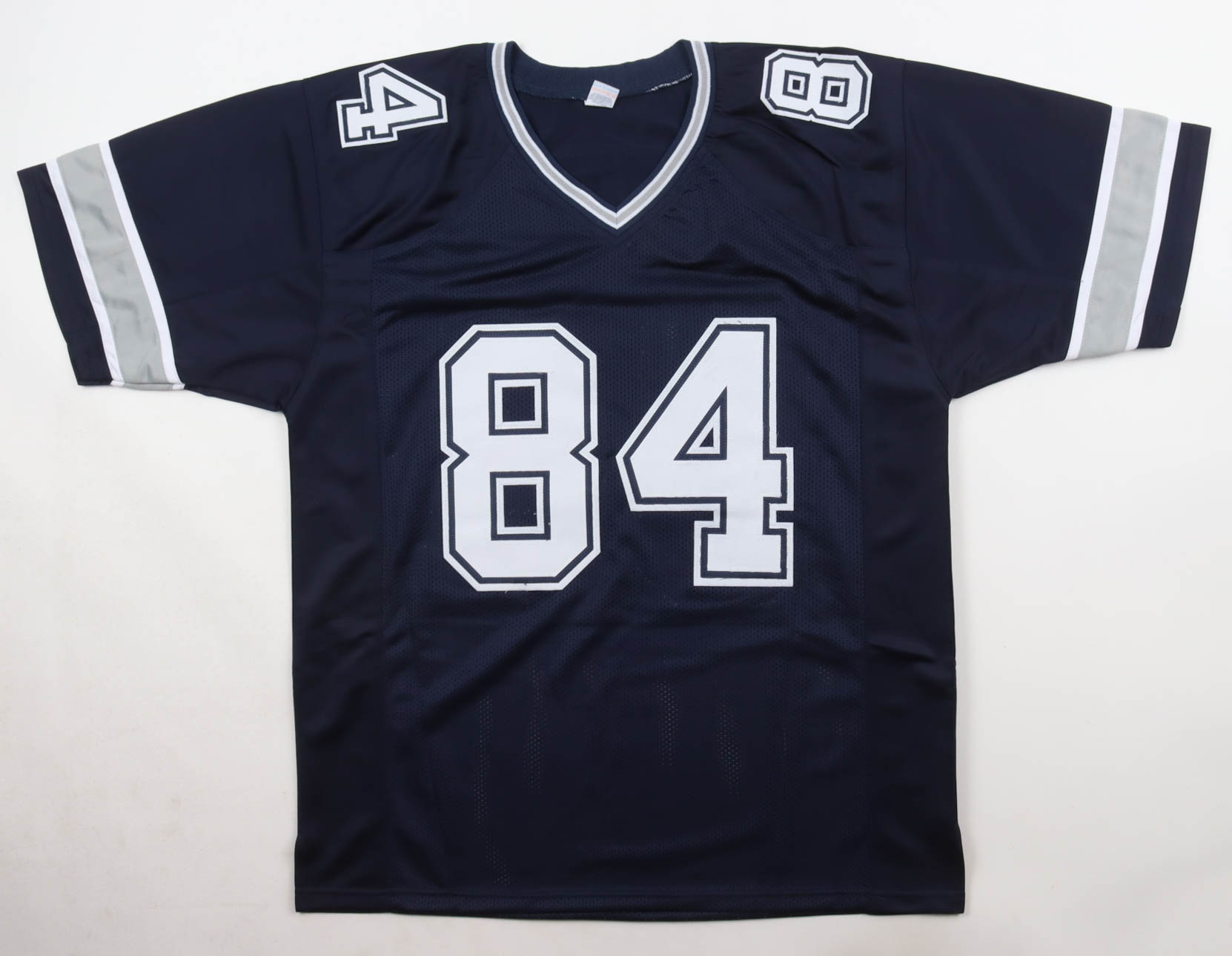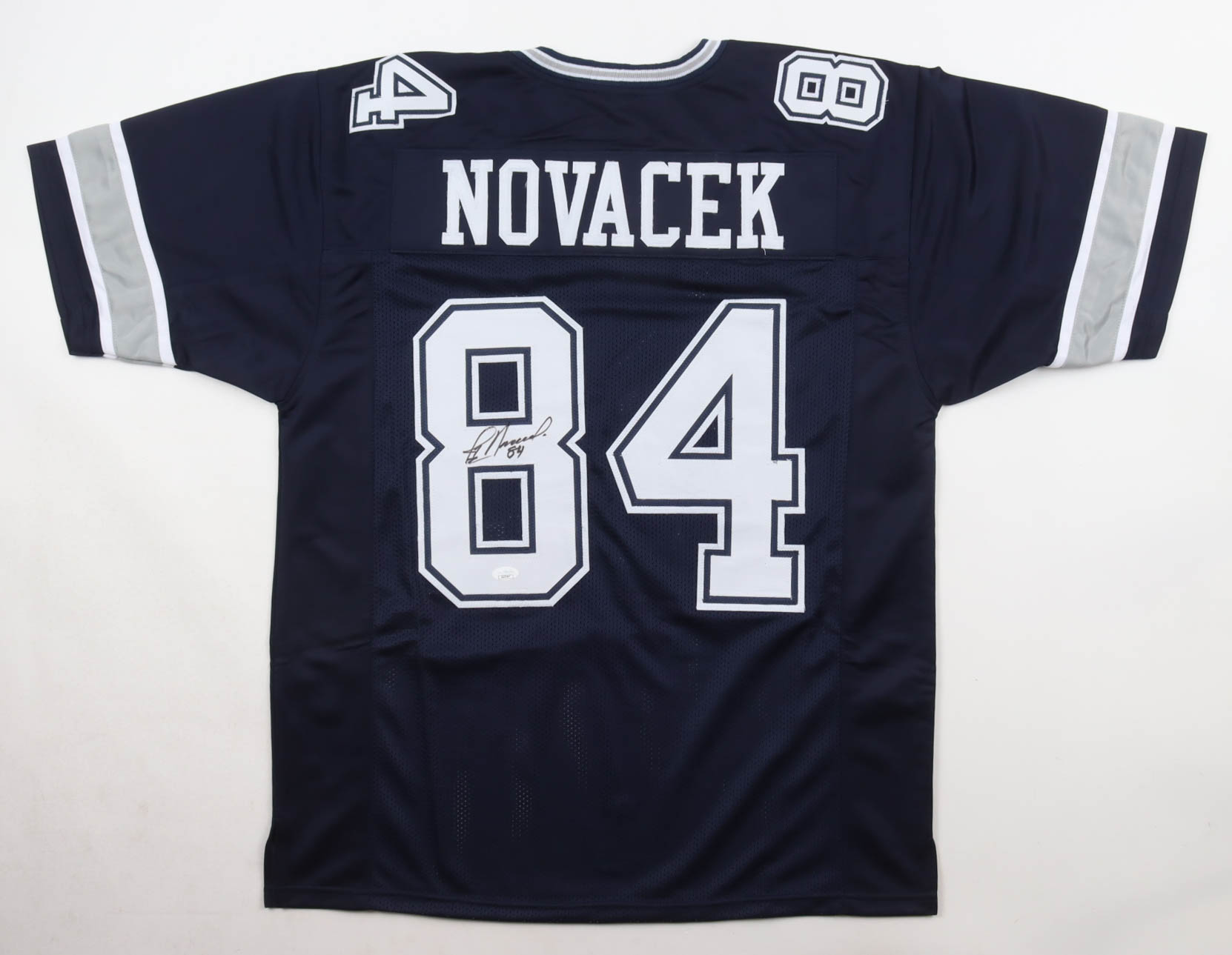 Custom jersey with everything sewn on, size XL. Hand-signed by Jay Novacek. Please note, glue is visible through the reverse number.