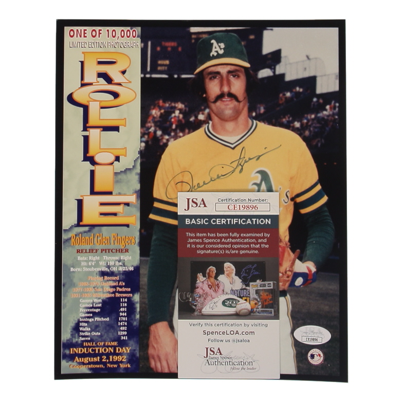 Photo measures approximately 8" x 10" in size and has been hand-signed by Rollie Fingers (Oakland Athletics, HOF).