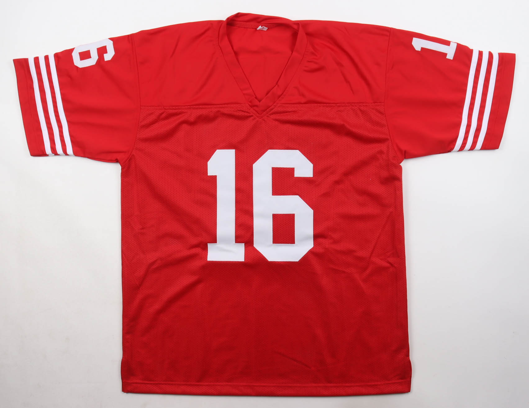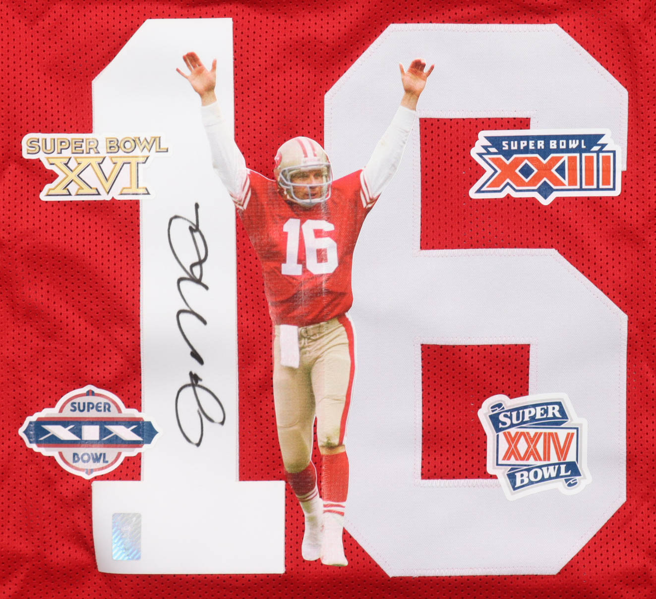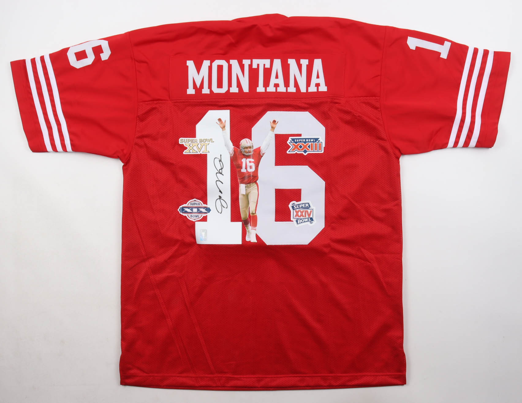 Custom jersey with everything sewn on, size XL. Hand-signed by Joe Montana (HOF). The jersey features a custom photos pressed on the back of the jersey.