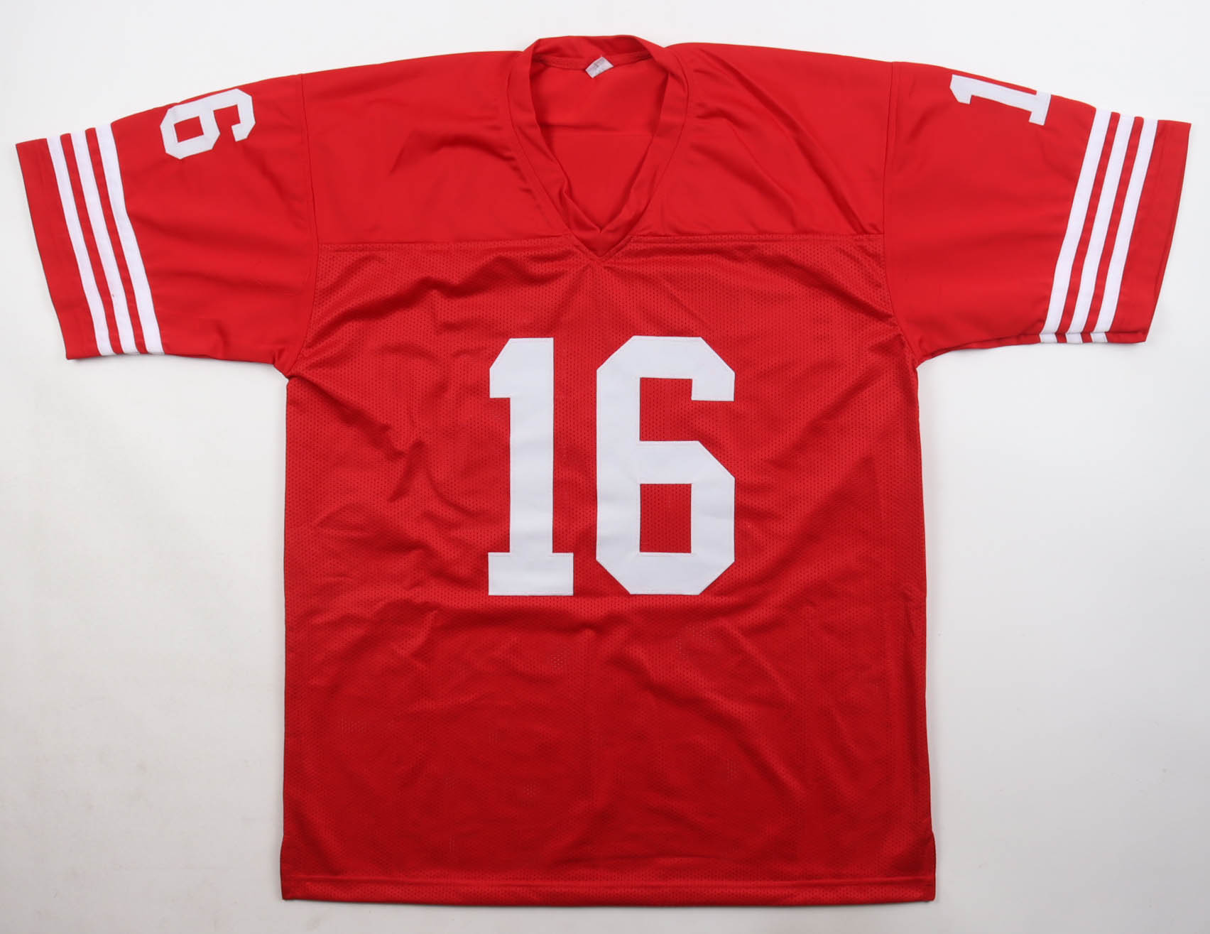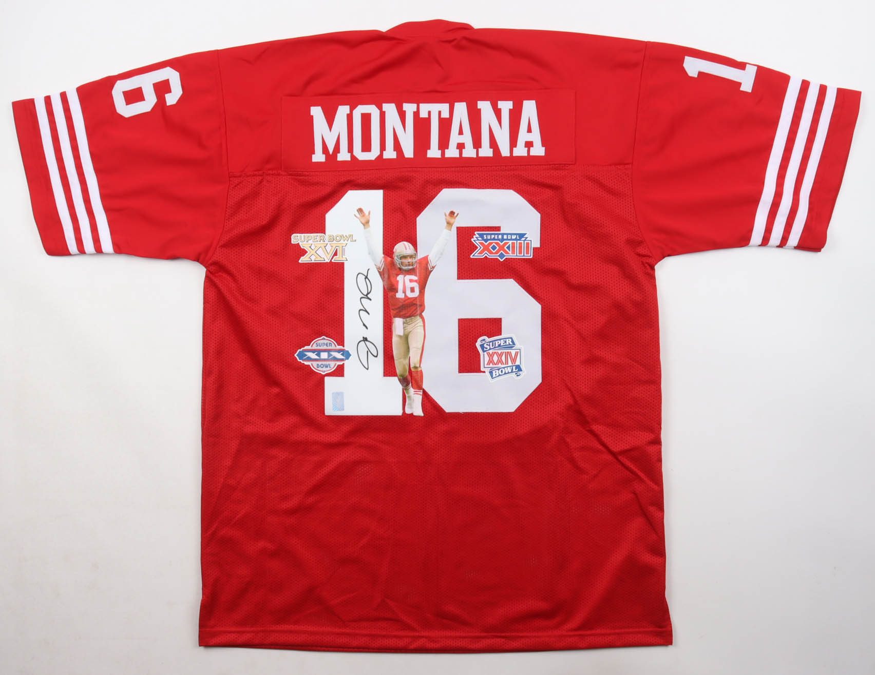 Custom jersey with everything sewn on, size XL. Hand-signed and inscribed by Joe Montana (HOF). The jersey features a custom photos pressed on the back of the jersey.