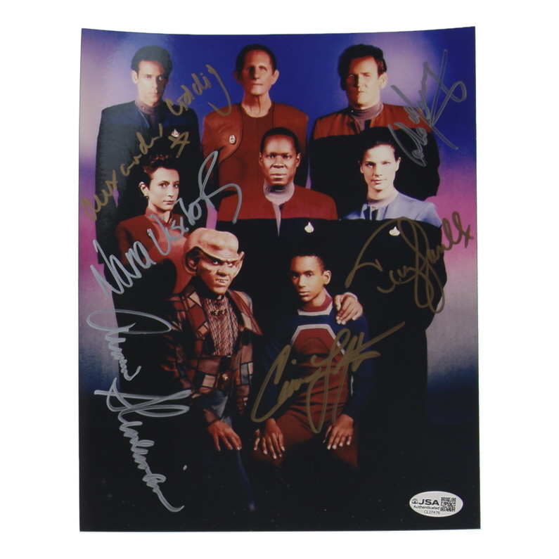 Photo measures 8"x 10" in size and has been hand-signed by (8) with Terry Farrell, Armin Shimerman, Alexander Siddig, Cirroc Lofton, Nana Visitor, and Colm Meaney