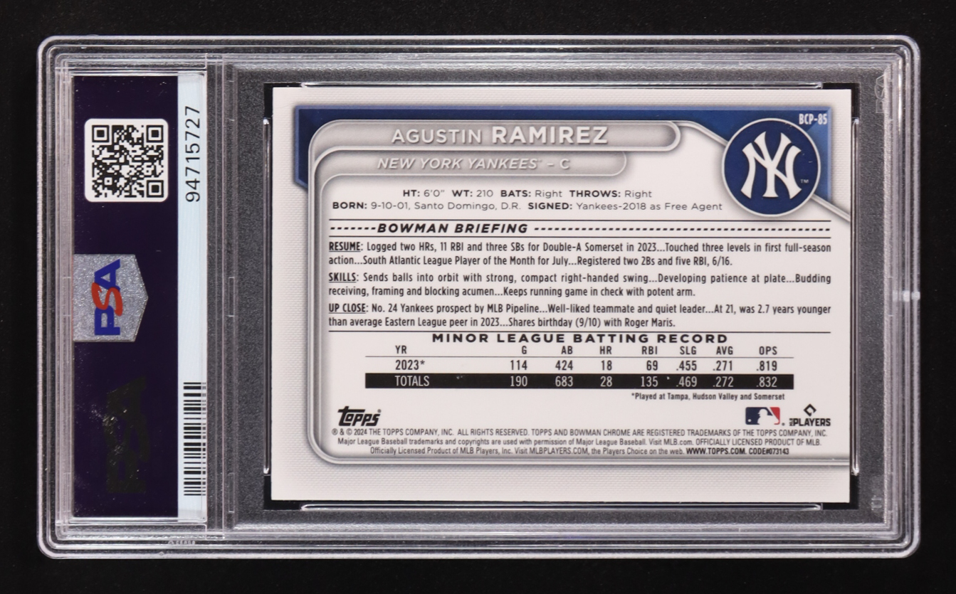 Agustin Ramirez 2024 Bowman Chrome Sapphire Prospects Gold Refractors #BCP85 #19/50 RC (PSA 10)
